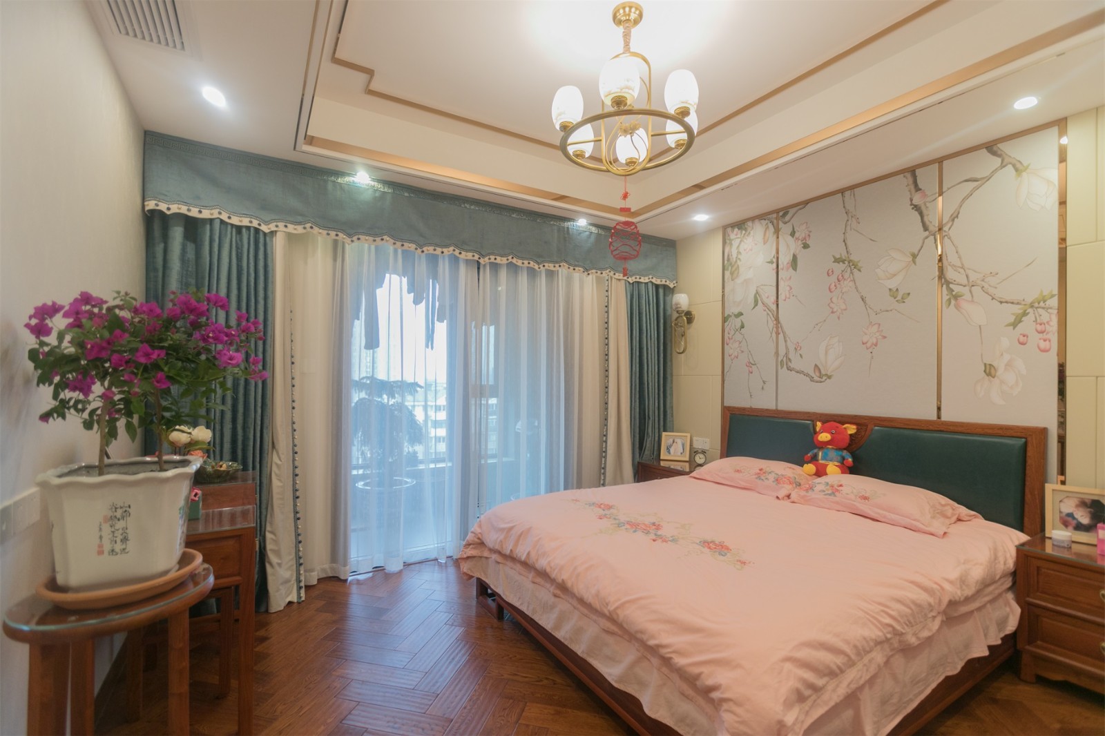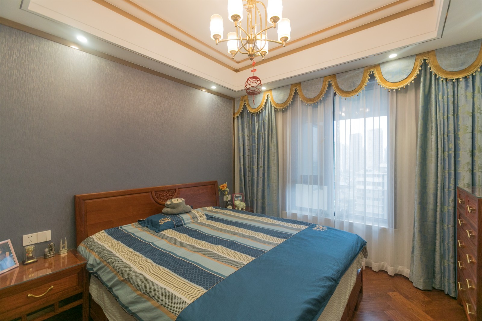 古色古香的卧室门,做旧复古的吊灯,镶边处理的吊灯让卧室洋溢着一股古韵气息,而淡蓝色的床具则让空间多一抹轻快明丽的气息 6686官方版app。