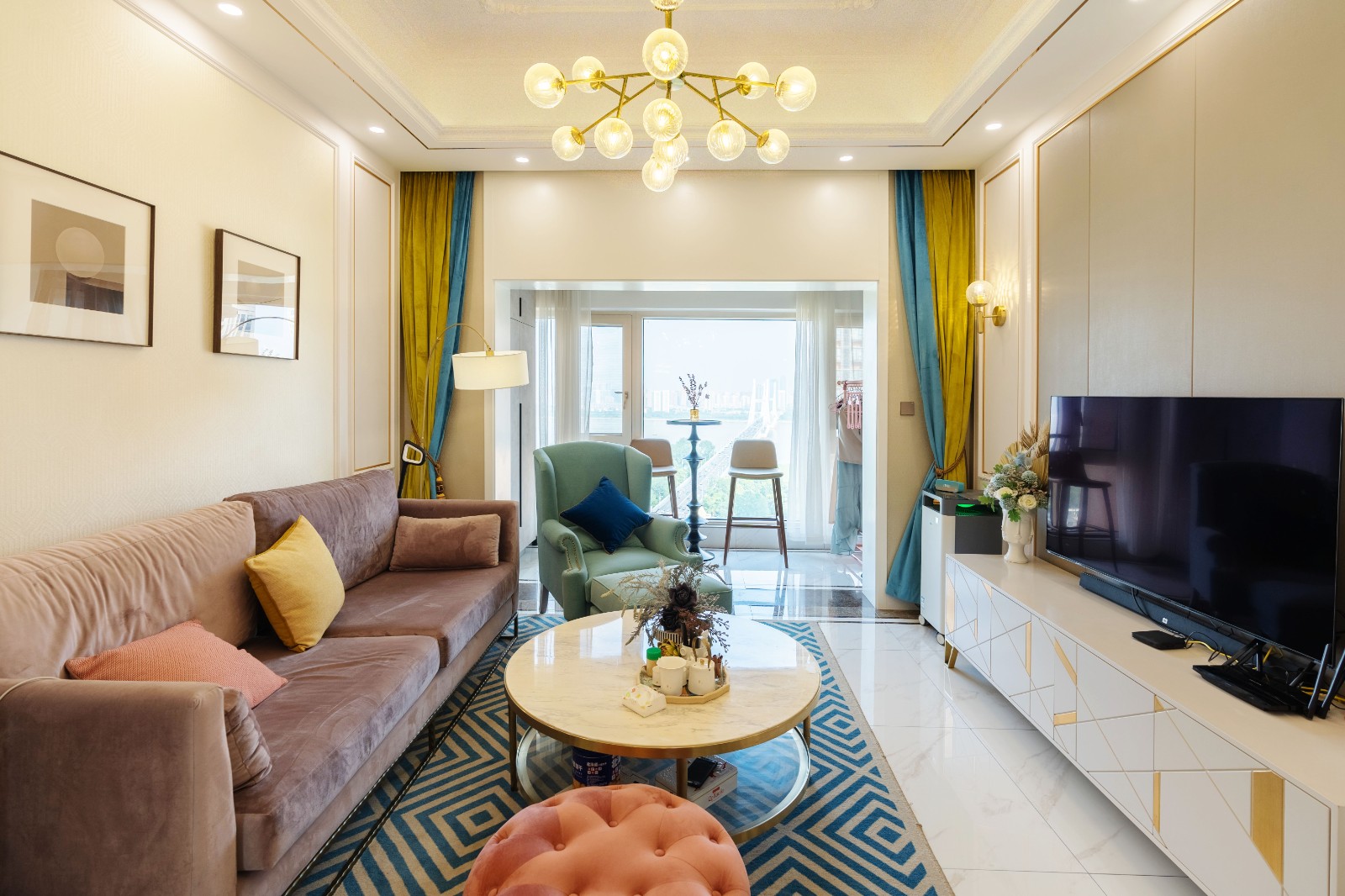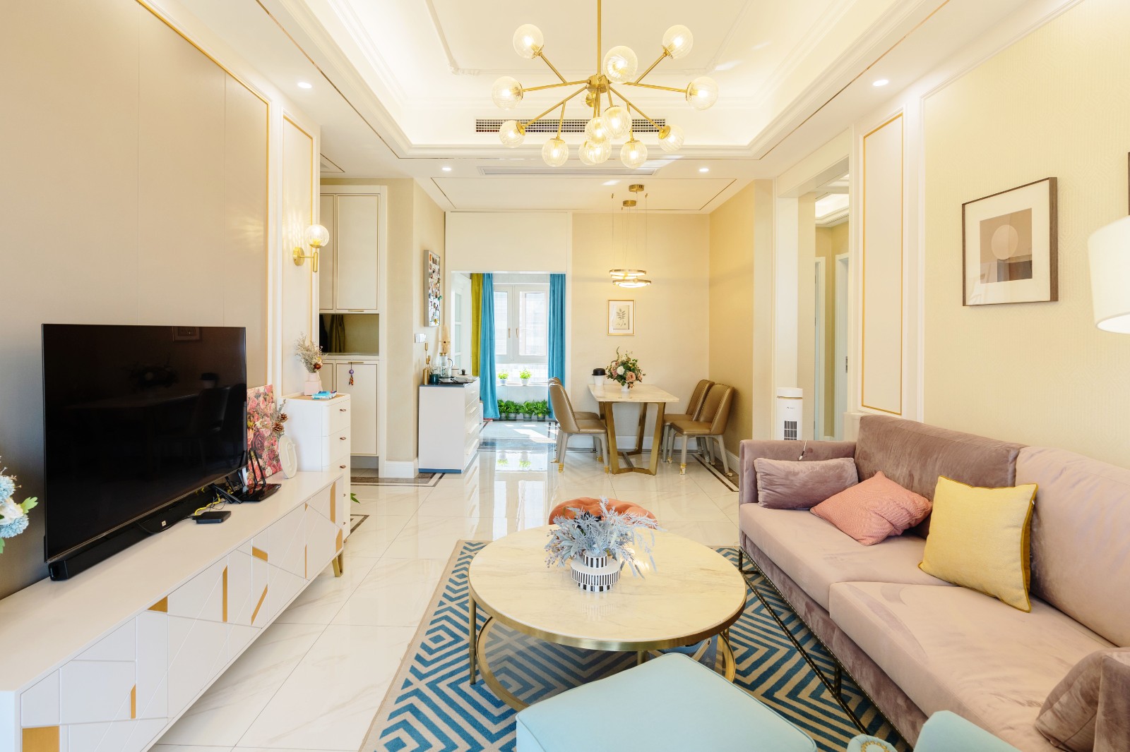 客厅区域主要通过各类色彩来营造空间的精致感与温馨氛围,丝绒材质的藕粉色沙发与蓝色几何图形地毯之间的碰撞高级而又耐看,墙面的金色镶边处理,则让空间的欧式贵族风情得到展露 6686官方版app。