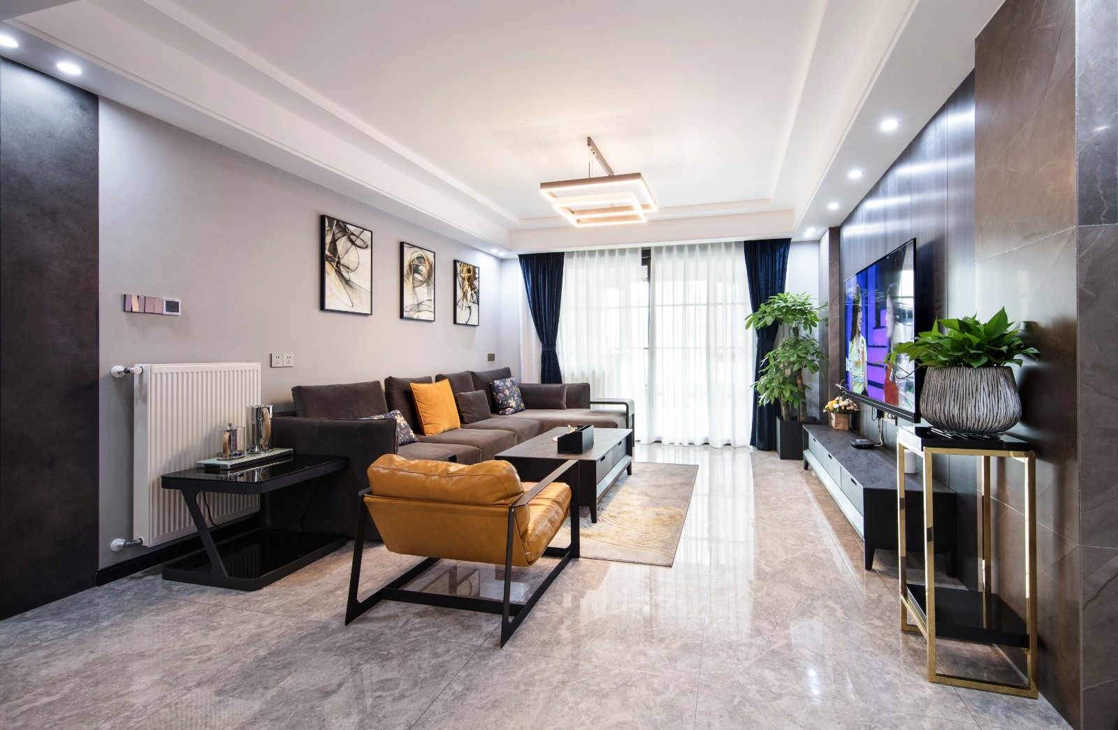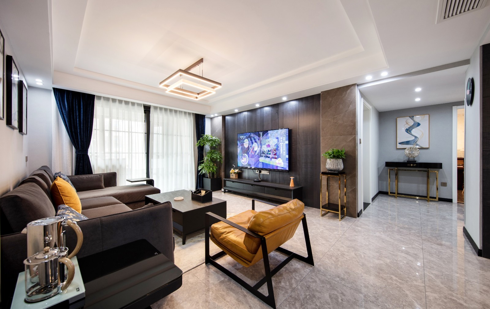 背景墙与沙发颜色上的呼应保障了整个空间的衔接感,蓝色丝绒窗帘,几何造型灯饰,则增添了空间的摩登气息 6686官方版app。