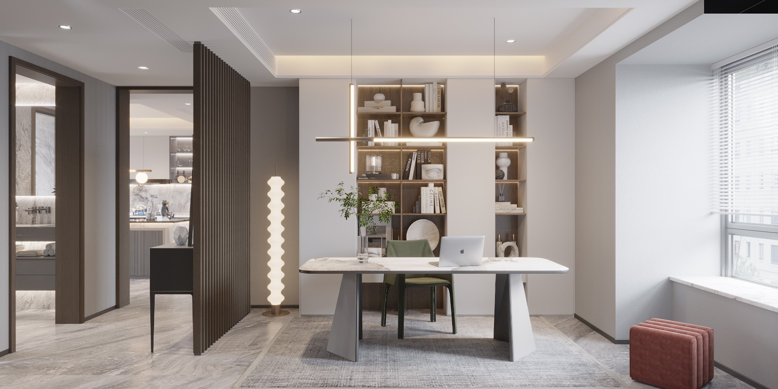 书房借助木质栅栏进行隔断 6686官方版app,有效提升空间艺术氛围感的同时增添了区域通透感。