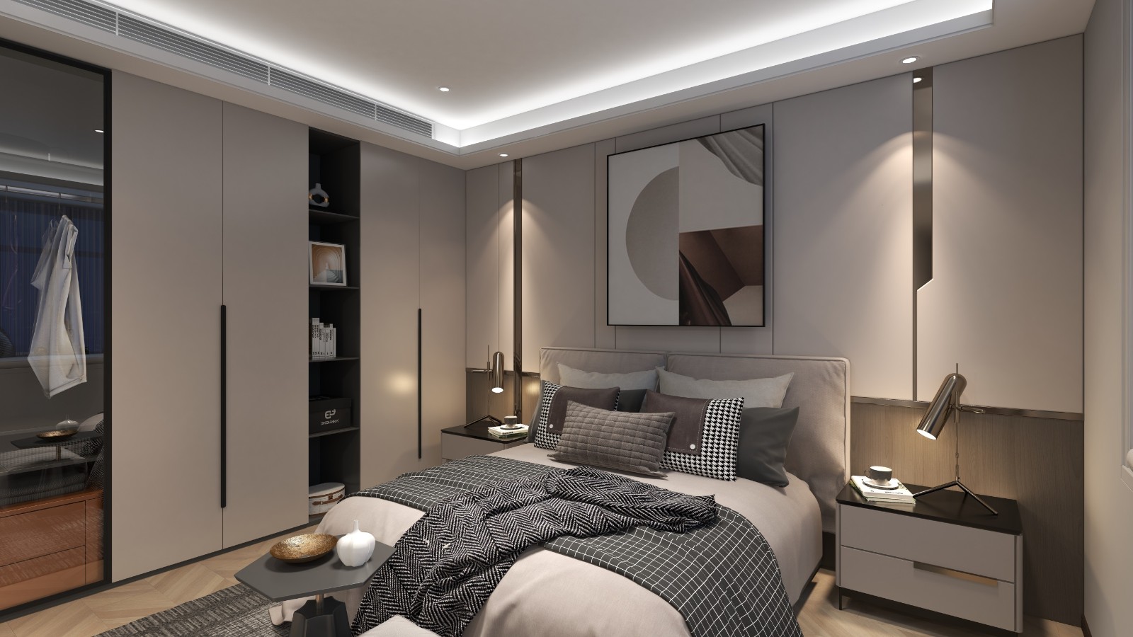 卧室背景墙借用线条抒发空间简约洁净氛围,舒适柔软的床具搭配上简洁大方的设计 6686官方版app,让人在素雅洁净中更好享受生活的宁静。