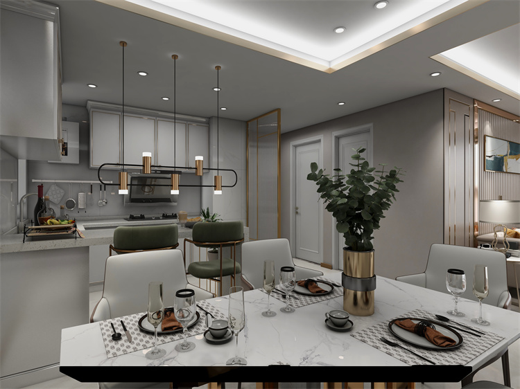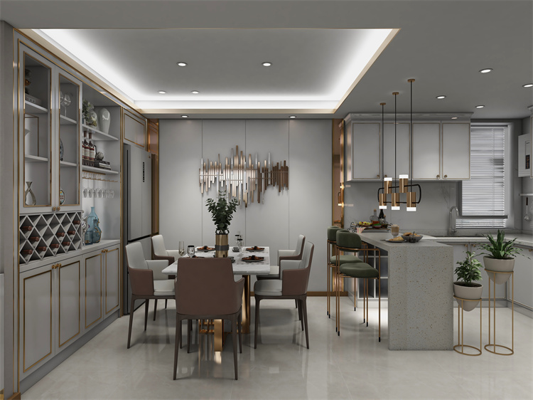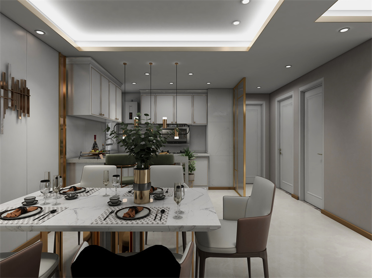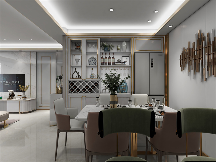 就餐区域沿用与客厅一致的白色及镶边处理,强调空间和谐感 6686官方版app,墙面区域的简单艺术摆件现代时尚气息浓厚,为空间增添摩登色彩。