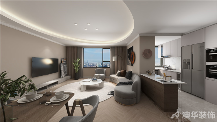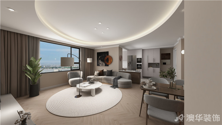原本色搭配上白色强调空间简约整洁氛围,曲线型沙发 6686官方版app,圆形吊顶以及圆形地毯则通过线条的变化来提升空间的独特艺术氛围。