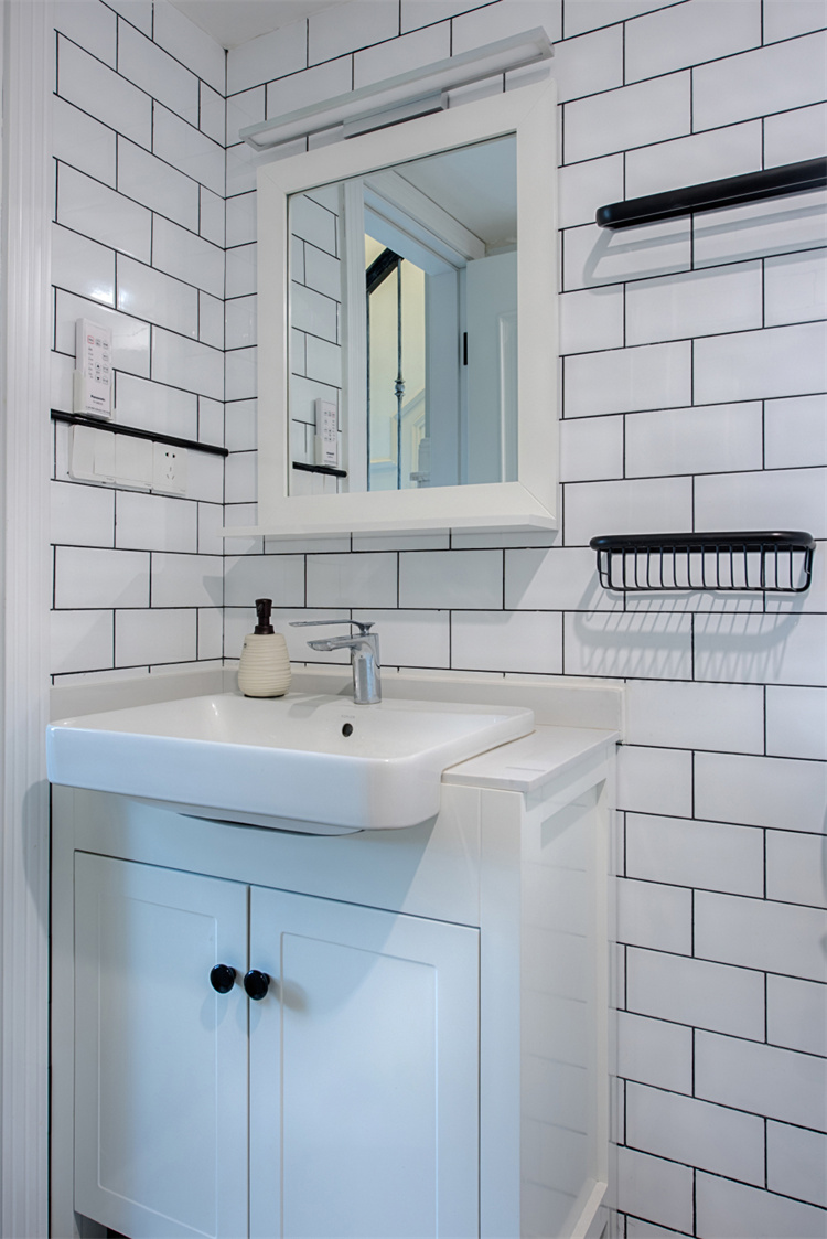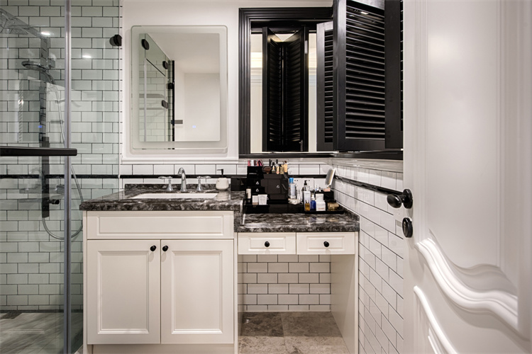 白色小块瓷砖铺设墙面,强调细节精致感,深灰色大理石墙面则为空间增添沉稳气息 6686官方版app。