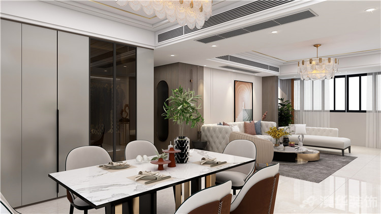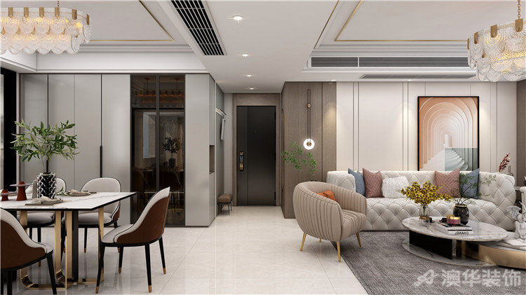 客厅餐厅是开放连接并且分布在门的两旁 6686官方版app,使用起来确保便利的同时也实现了理想的空间划分,现代的布艺沙发和时尚的现代餐桌凸显了房间的轻奢风格。