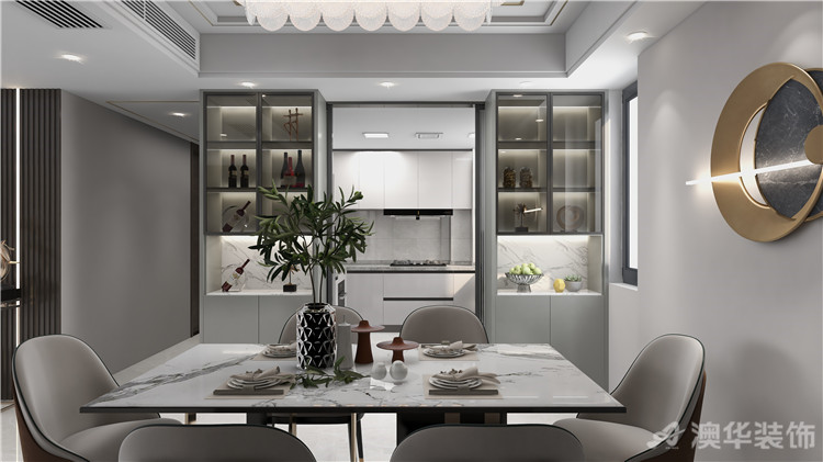 白色风格简单时尚,酒柜和灶台浑然一体,桌子上绿植使得房屋生机勃勃 6686官方版app。