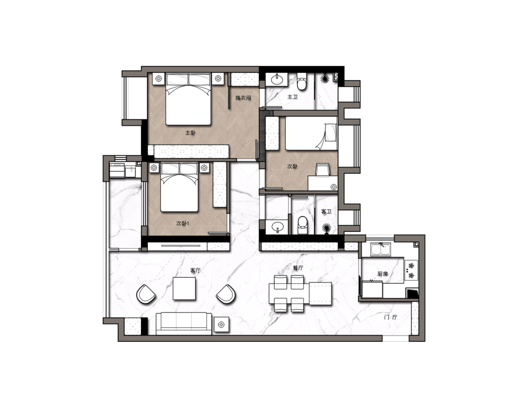 1 将一间次卧纳入主卧内部,打造步入式衣帽间。收纳开阔富足,提升生活品质。