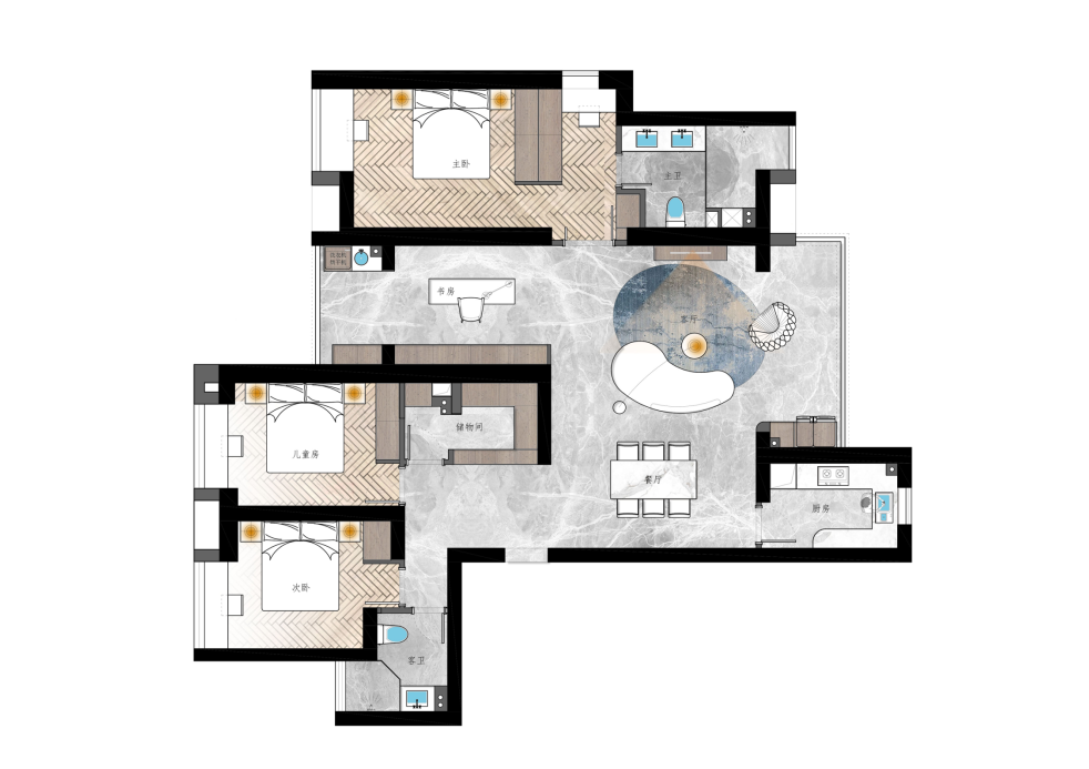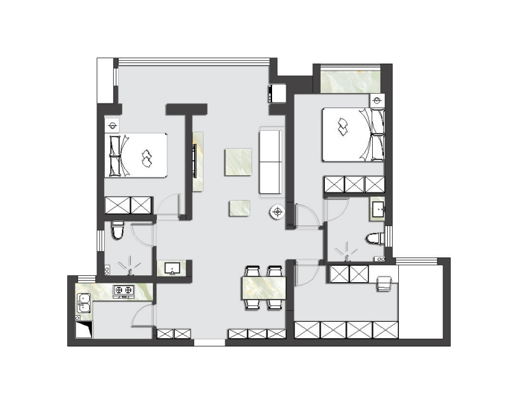 5 北面卧室独立分区,改造一个功能型书房,加一个小孩房或者客卧营造豪华舒适的实用空间。