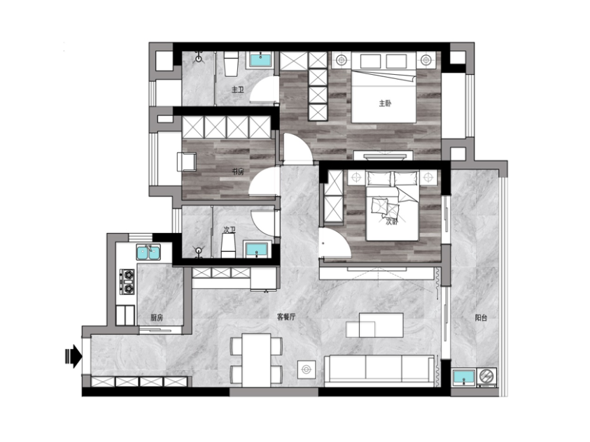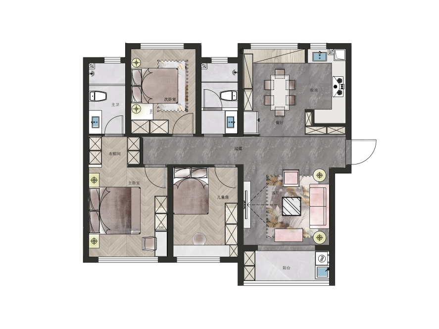 3 重点规划主卧室、主卫和小孩房,增强功能与舒适性。