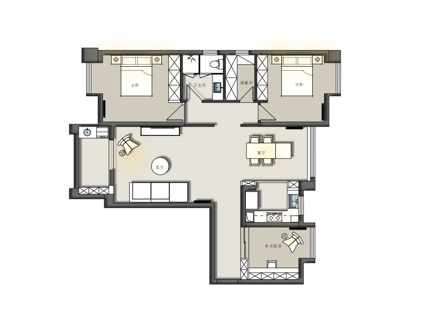 1 将主卫纳入主卧,并设置L型衣柜,补充收纳,形成一个功能齐全、舒适便捷的私人空间。