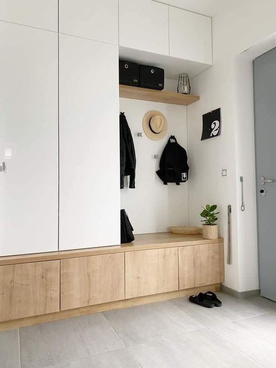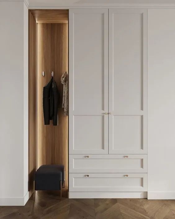 ⑥增设换鞋凳:直接将换鞋凳设计在挂衣区下方,节省空间又简洁美观;也可以直接选择成品换鞋凳,注意尽量选轻巧灵便的款式,需要预留可以摆放的位置。
