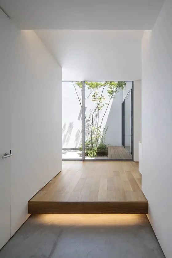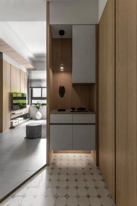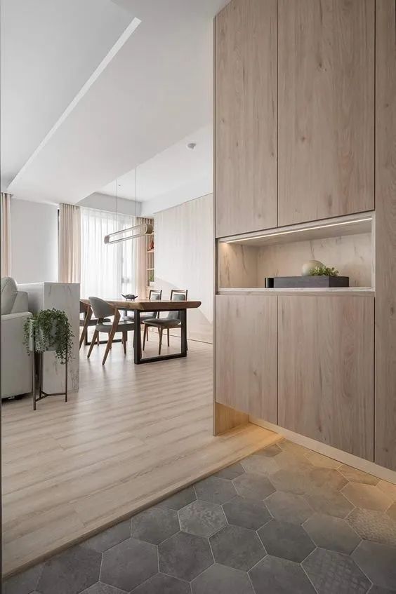 ②用不同材质做区分:做不到标准的下沉式设计,我们可以通过不同材质的拼接,让室内外做出1-5cm左右的高度差,最常见的有玄关铺瓷砖+室内木地板。