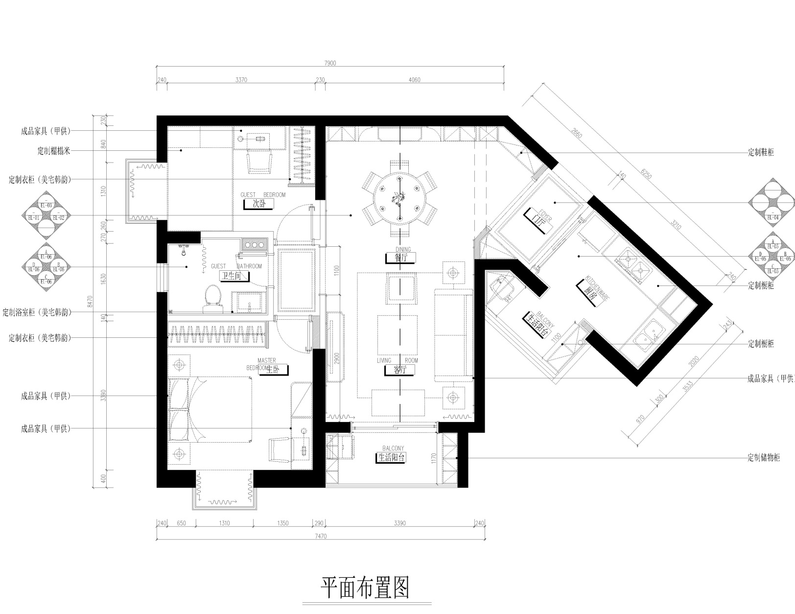 世纪江尚这套89㎡的房屋户型存在着较大缺陷,原本房屋建筑面积就不算大,还存在着一个突兀的拐角空间,因此在设计时需要对空间的功能区域进行合理的划分,同时对拐角区域的空间进行合理的利用,以避免空间出现违和感。而由于房屋整体面积较小,因此家具的选择上则多考虑小体量家具,避免造成视觉违和感。