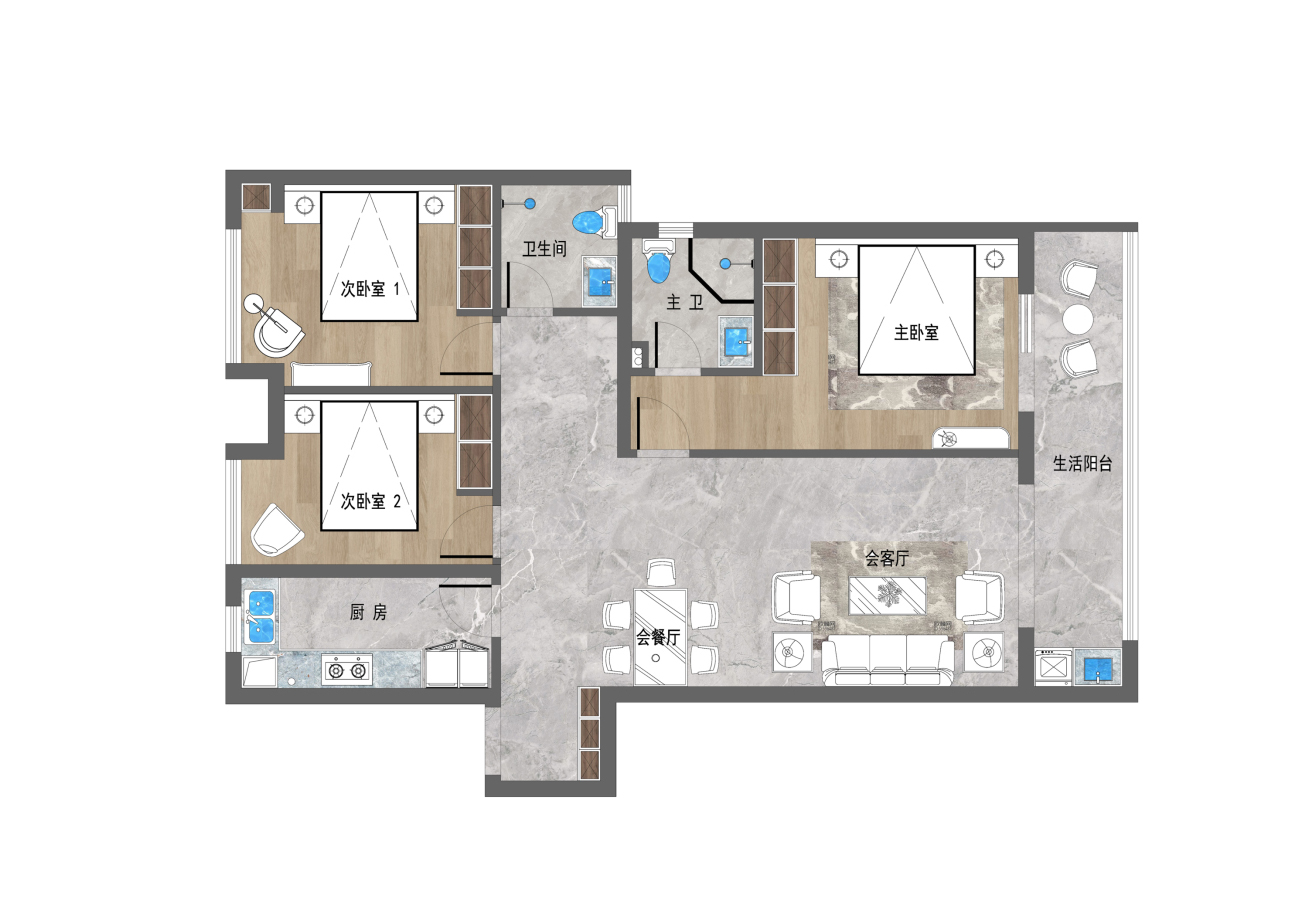 3 两间次卧打通,形成一个衣帽间+主卧+主卫的舒适套卧,打造高品质私人生活。