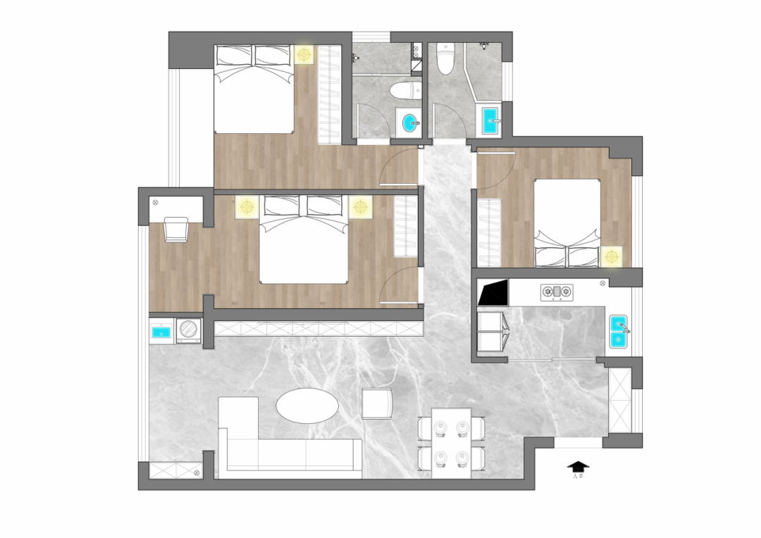 4 次卧做干湿分离,增加使用率;保留三间卧室,满足多人口家庭居住。