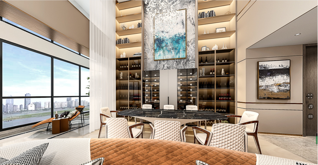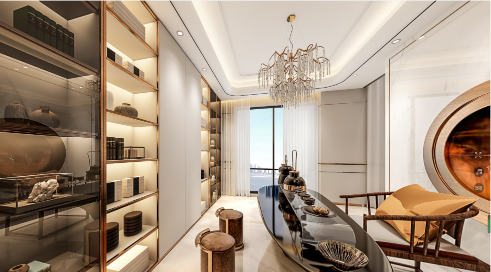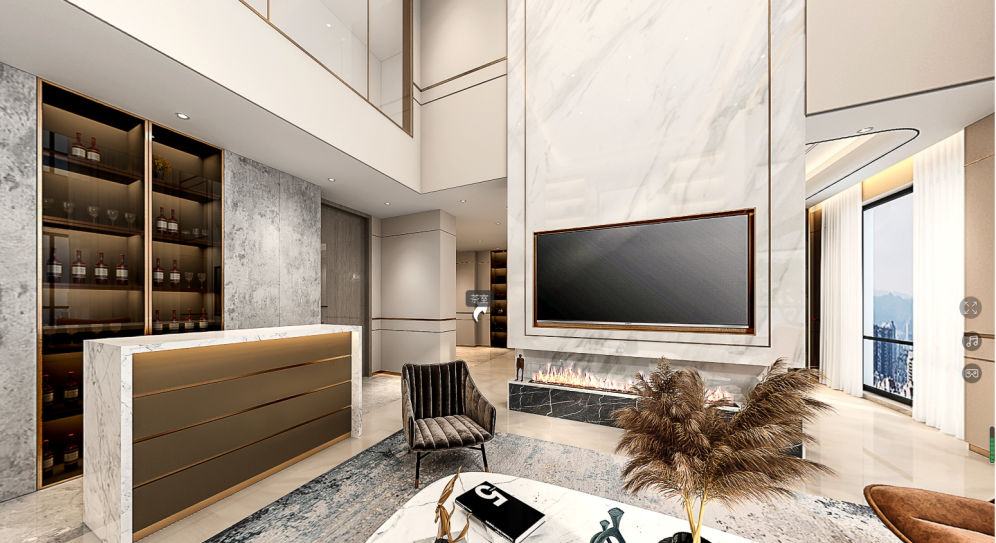 • 岩板的电视背景墙扶摇而上,彰显大气风范。电视内嵌其中,边侧以金属线条进行勾勒,造型简单用材精致,低调中呈现出轻奢的贵气质感。 边侧内嵌酒柜,与餐厅酒柜相呼应,金属色的横竖交织条不仅使整个空间 更加有层次,突显沉稳品味。