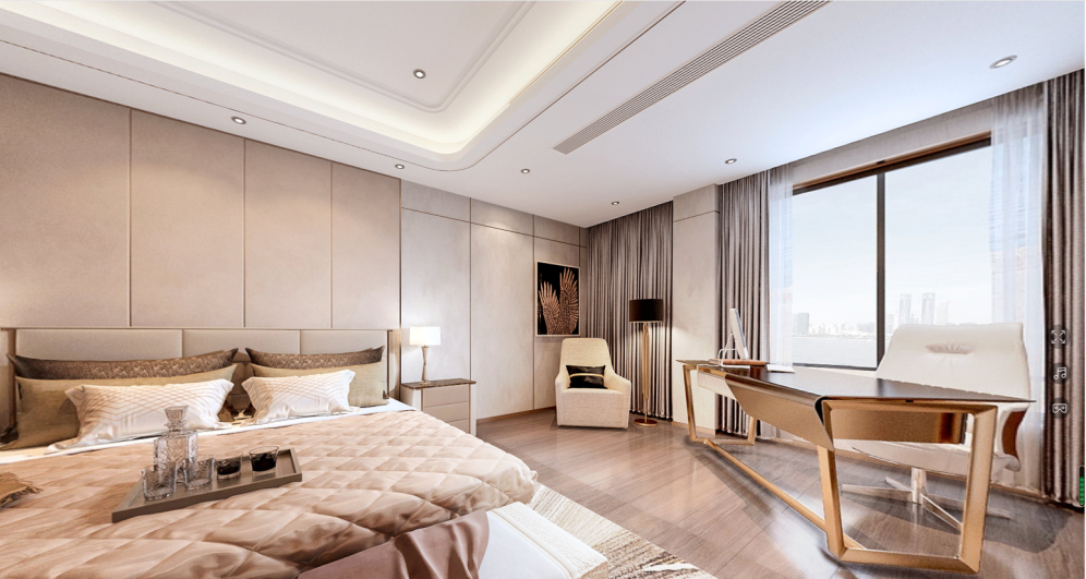 • 以浅咖色作为主色调,呈现温暖舒适的就寝氛围。墙面采用白色、浅咖色拼接而成,过渡自然,带来清新、明快的感觉。 地面选用纯实木地板,冬天即使光着脚丫踩在地上也不会冰冷,大气的写字台满足主人的办公需要。