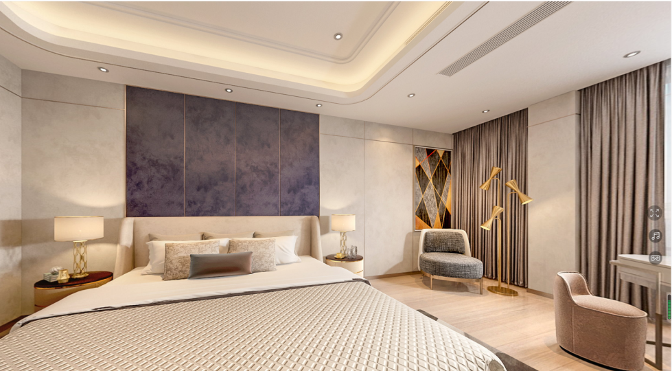 本案通用大色块基调,加以金属色的点缀及跳跃,在原本的灰调子里遇见高 雅的鲜明色,活跃生活气息,营造精致生活氛围。家具意在于线条与圆弧的碰撞,在配饰上营造着浪漫氛围,让客户在没有压力的生活情景中尽享奢华简约空间带来的舒适感。