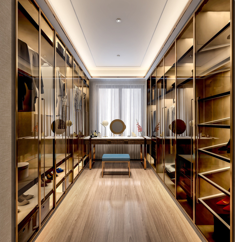 • 对称美学在这里得到了完美体现,通顶衣柜一左一右对立,中部设置梳妆台与方凳,整齐又和谐。 金框玻璃门的构造,让衣柜具有展示柜的功能。内部装上补光灯,撑起轻奢风,透漏出高级感,时尚美观。拥有这样有颜的衣帽间,品质感触手可及,做生活的主角,感受美妙生活。