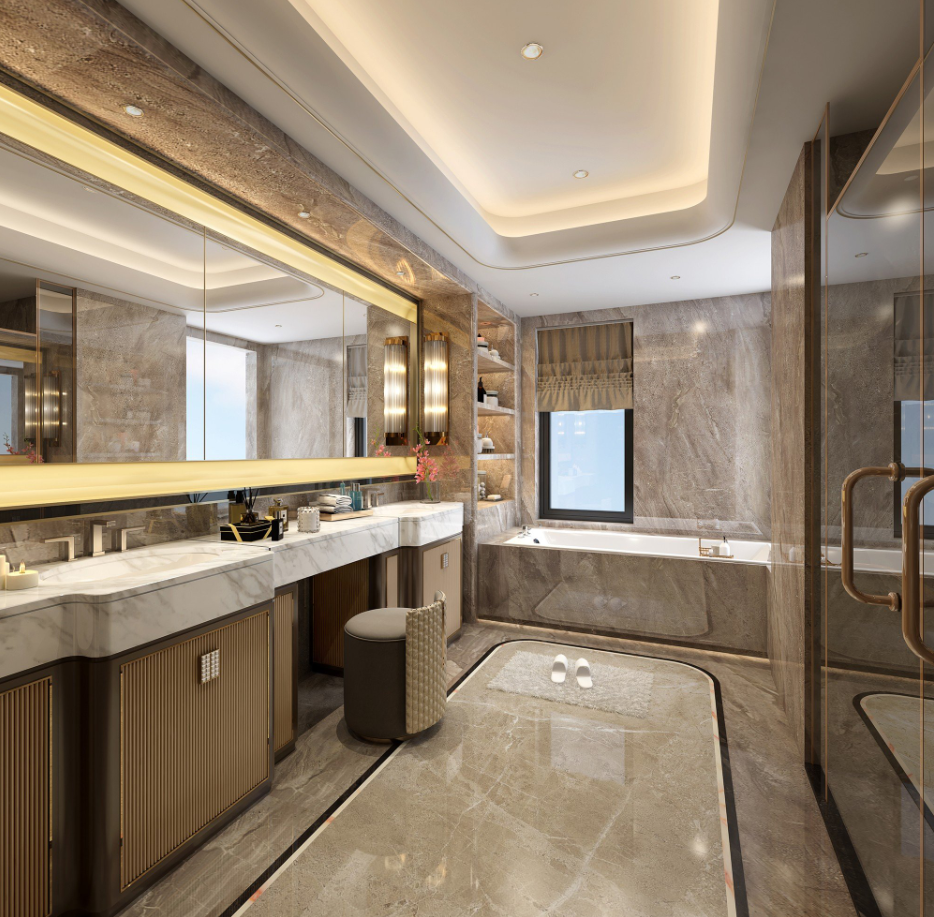 • 棕色大理石纹地砖与整体大地色系搭配,柔和的色彩过渡金色的五金,让整个空间更为内敛。
