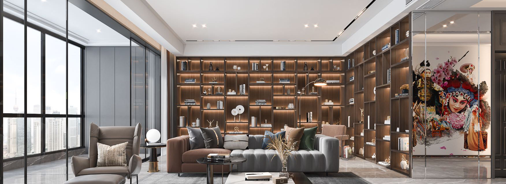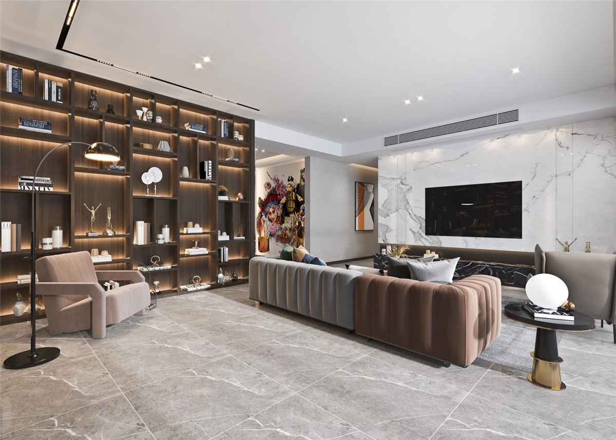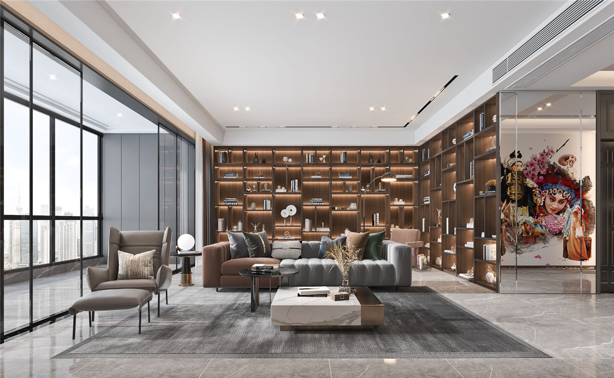 业主为艺术工作者,严谨中不失色彩,客厅满墙开放格装饰柜体现了业主不拘小节的气魄,整体色彩搭配沉稳大气
