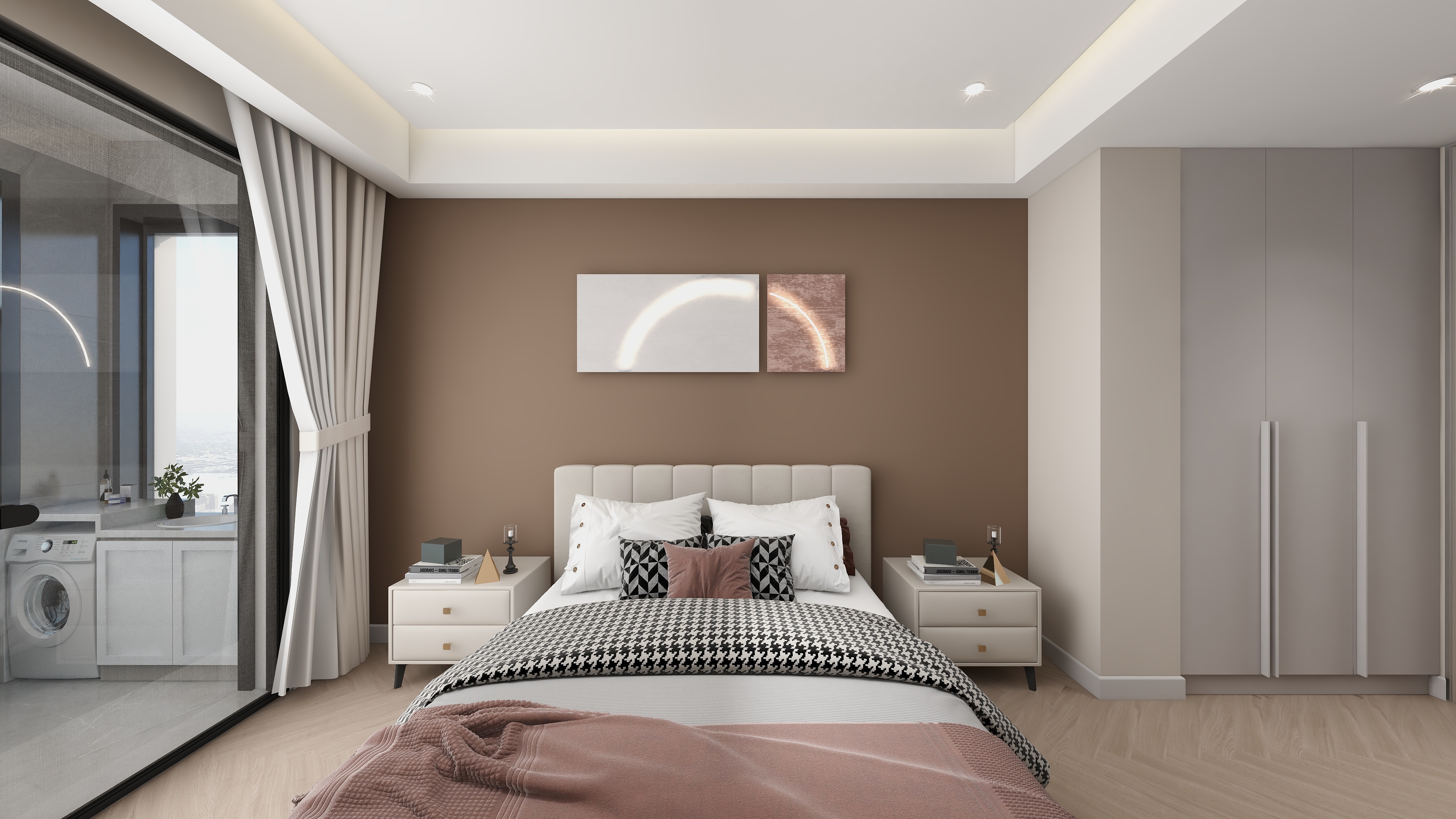 简约的墙顶面造型处理,面饰艺术涂料增加肌理感,高饱和度的大面色彩营造舒适氛围。