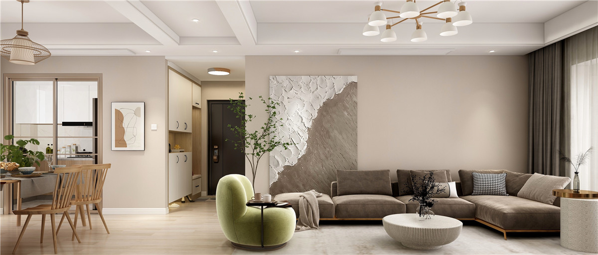 色彩明亮的客厅,暖冬的时候阳光洒满整个客厅理想空间,质地柔软的沙发,立体感极强的装饰立面,阳光穿透灰色的纱帘洒落在橡地板上,显现出无尽的温暖与明朗,让房子的主人更加舒适享受生活带来的新福时光。