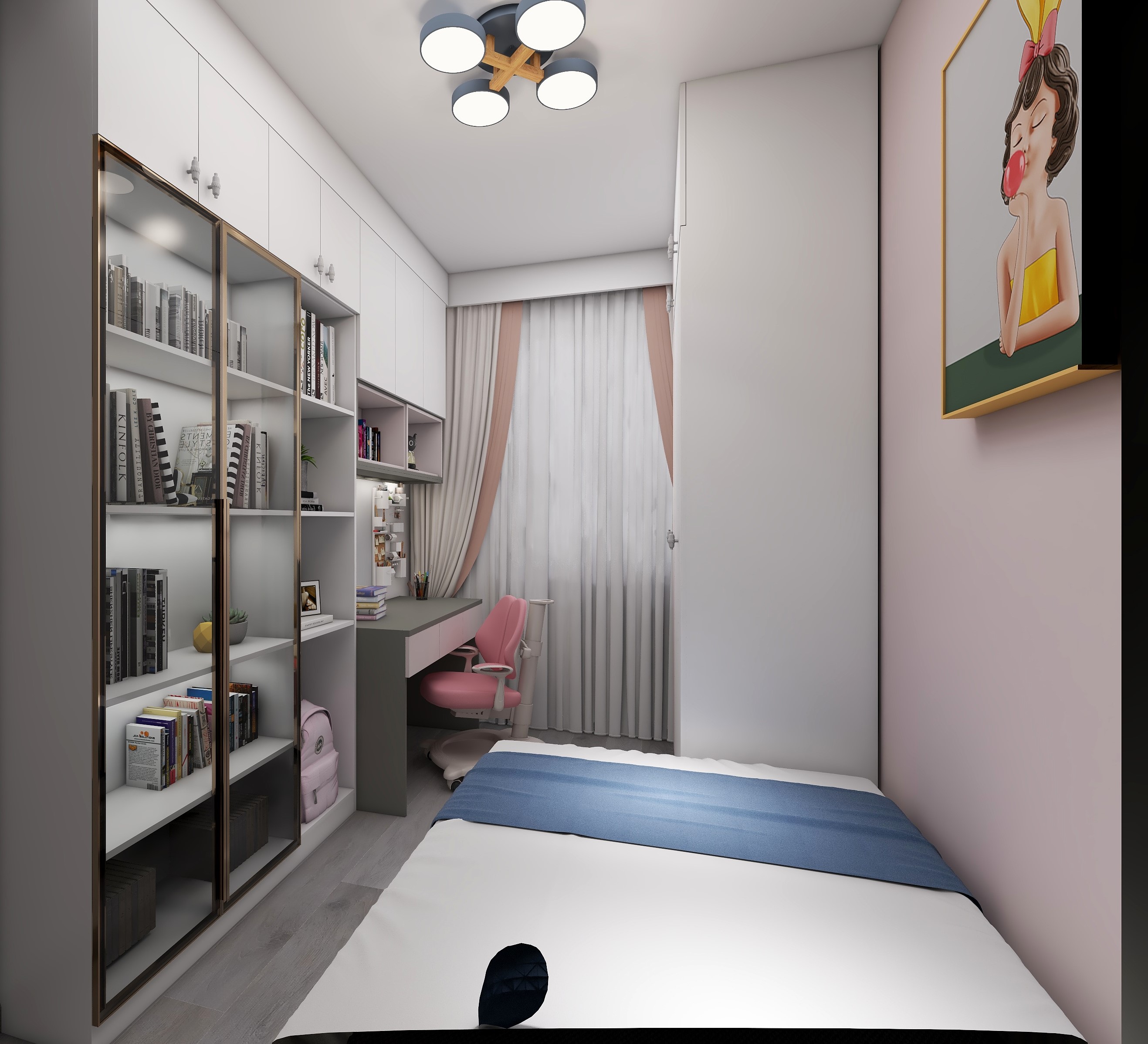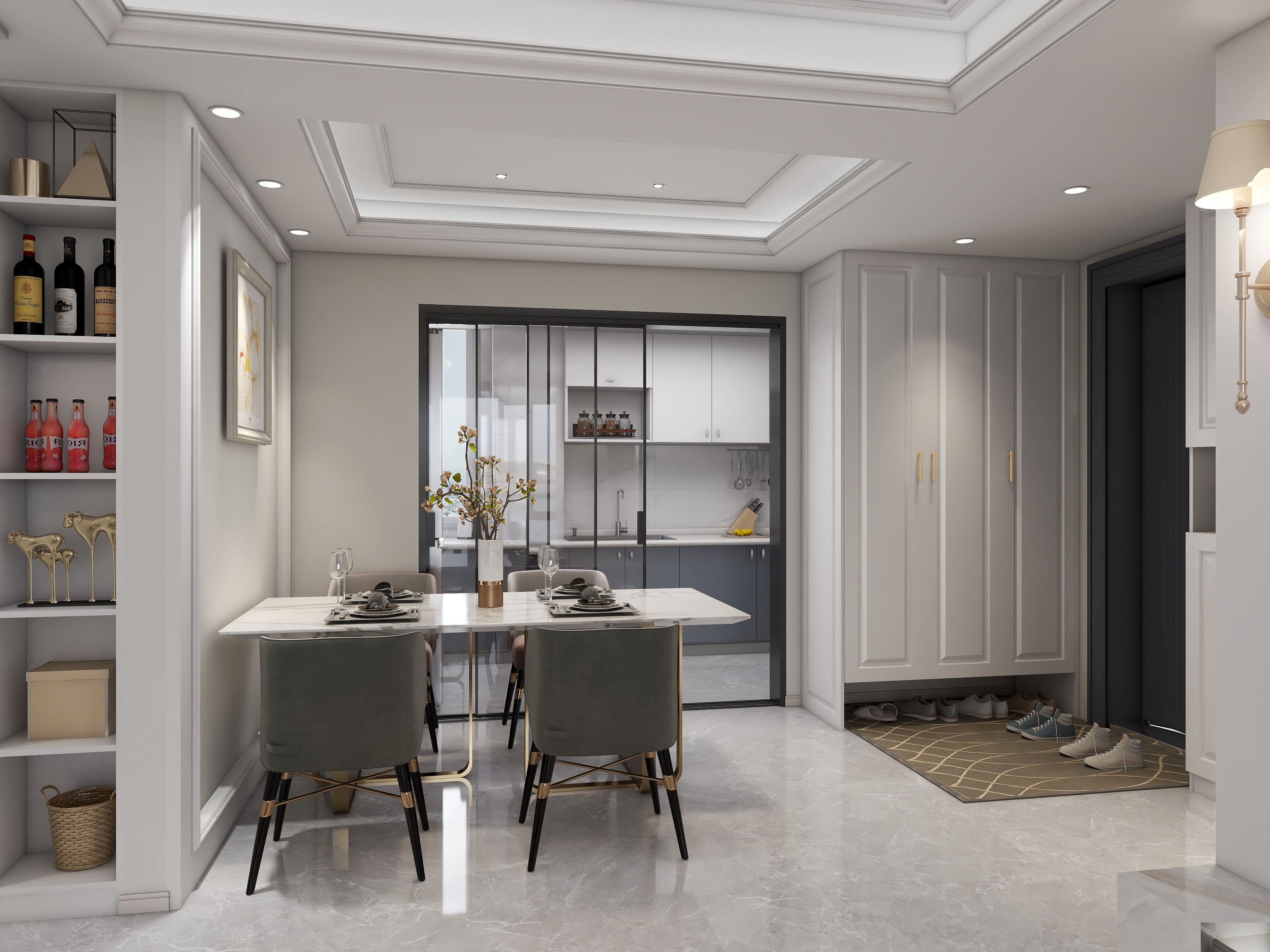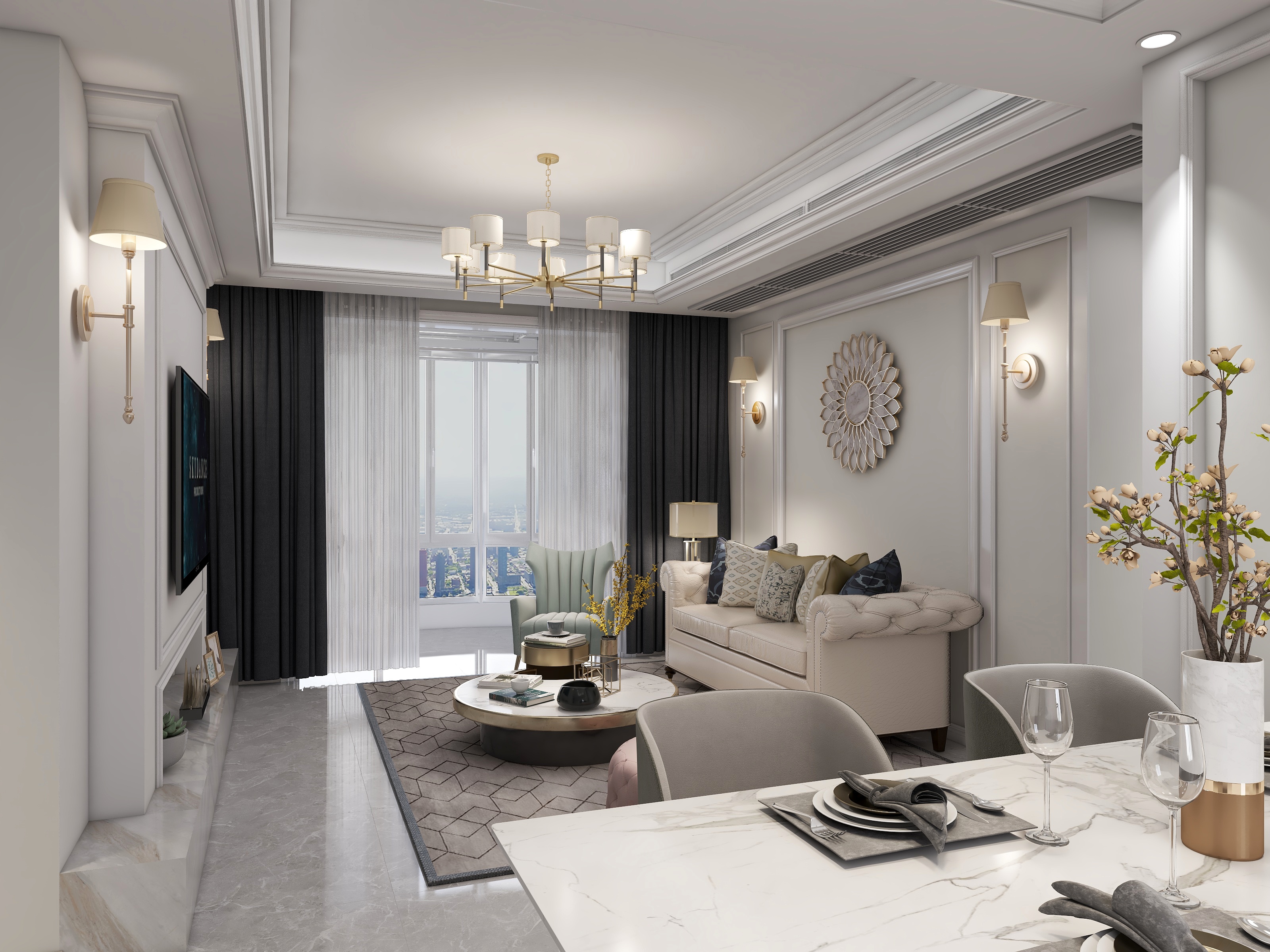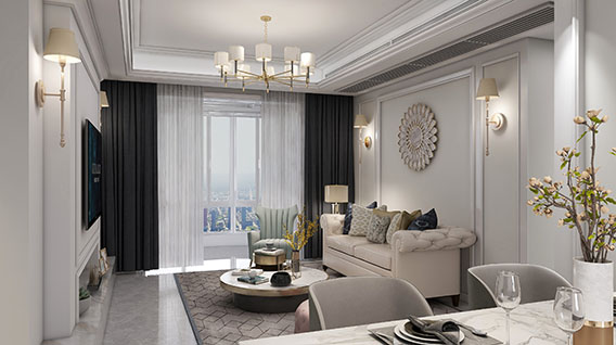 既想要现代风格的简洁,又想要法式的浪漫。于是这套现代清新的小美式混搭就此孕育出来。从硬装的手法上都是纯现代风格的,但是电视背景的壁炉造型,顶面,墙面的S线条,又化解了硬装上硬朗的线条。加上清爽的鹅蛋青墙面色,进一步给空间增加了几丝浪漫情怀。