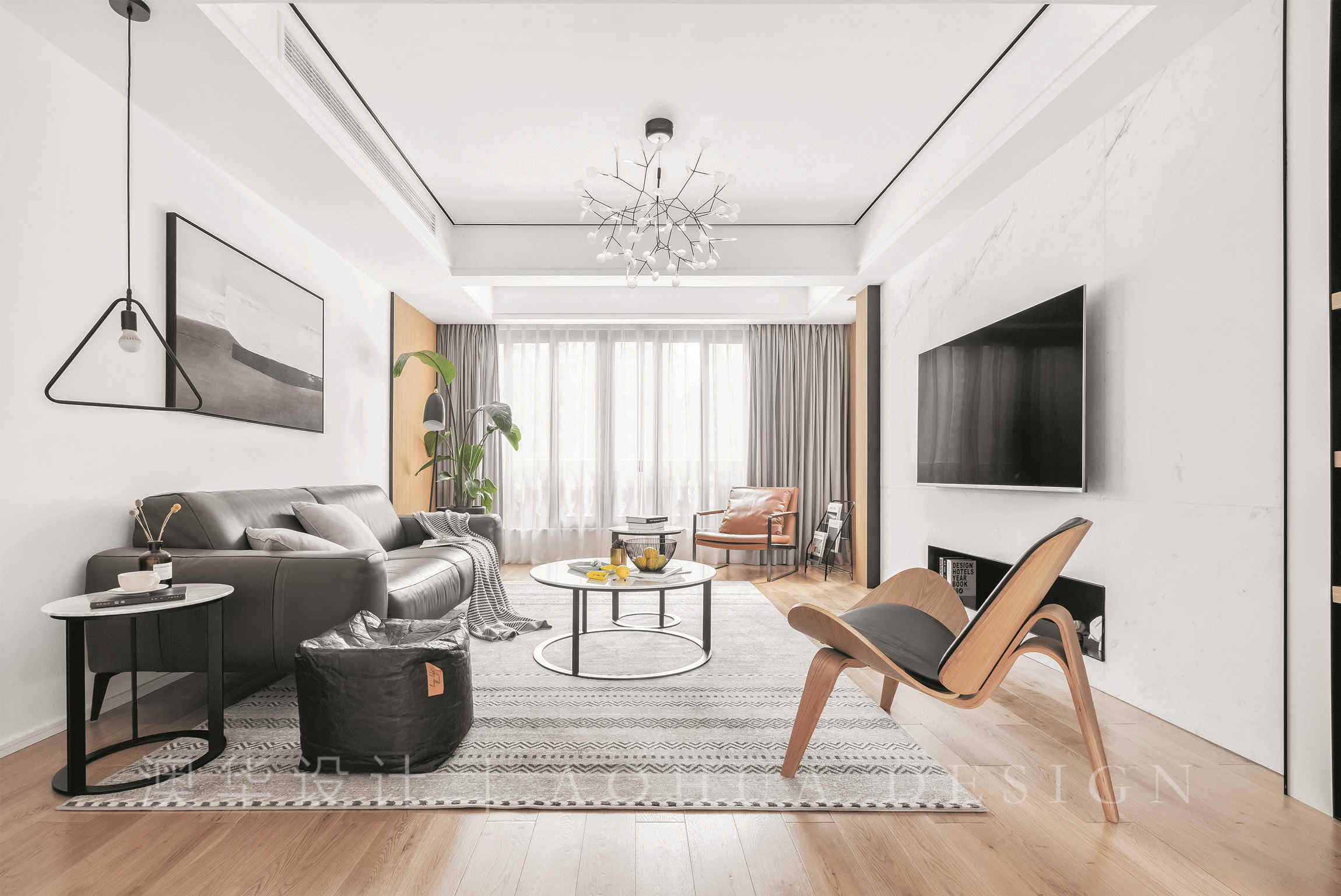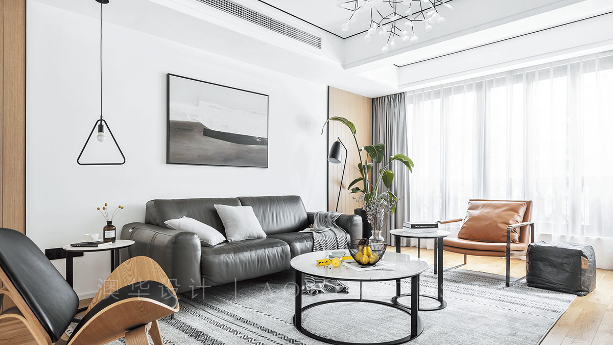• 客厅仍然以白色为主色调,通过原木色的融入以及灰色的过渡,呈现简洁明快的生活气息。将户型原本的阳台一分为二,留一部分做洗衣阳台,一部分并入客厅拓展空间。沙发背景面一侧的次卧门设计为木制暗门,与客厅完美融合。电视背景的左侧原有一处管道突于墙面,设计师通过将电视背景墙内凹壁龛设计,及右侧设置了对称的储物柜,增加客厅置物收纳的同时也消解了管道的突兀。在接口细节上,多处采用黑色不锈钢压边处理,简洁美观。黑色的壁龛设及开放柜的设计,为大理石背景增设一丝趣味感及层次感。