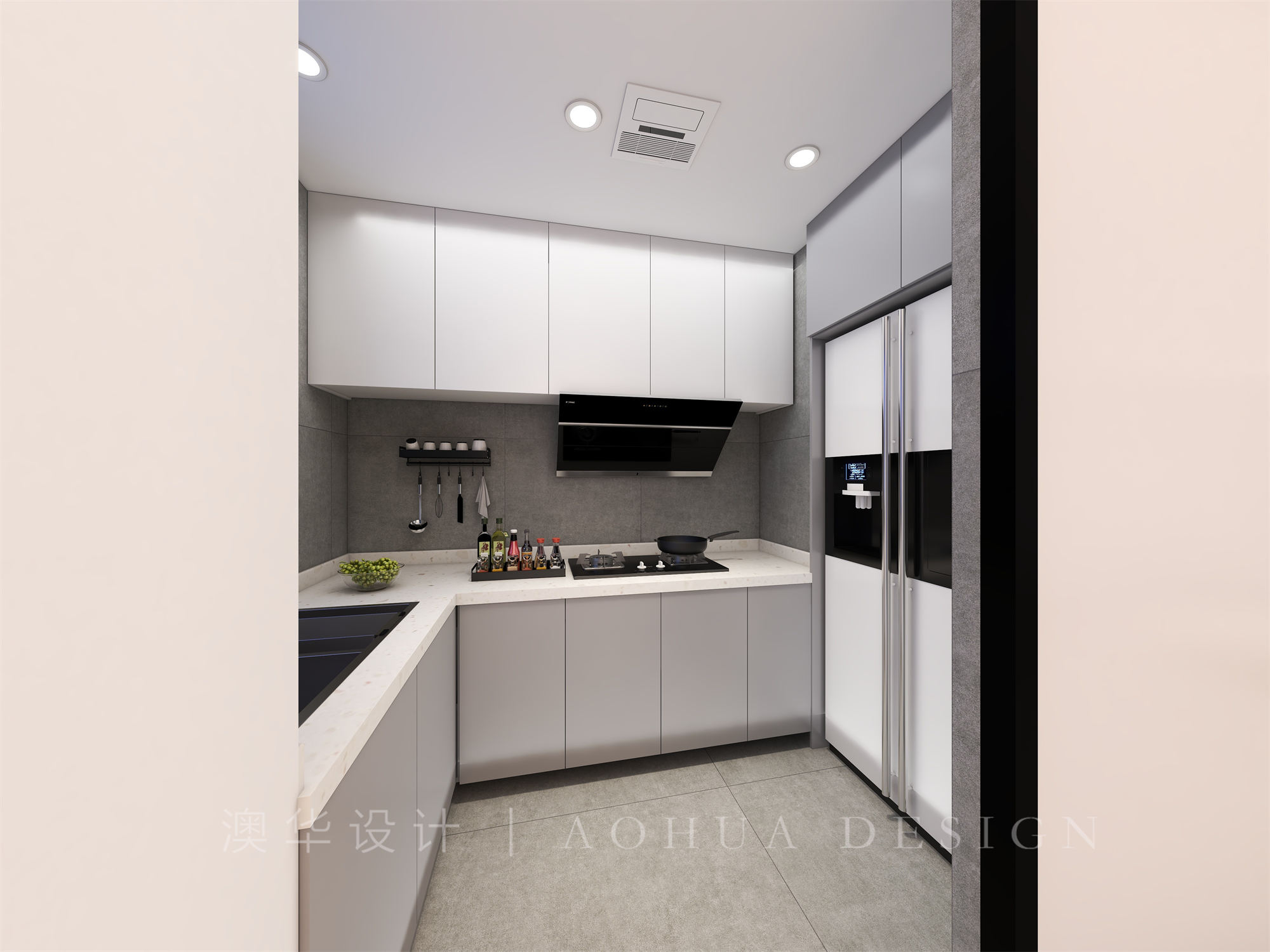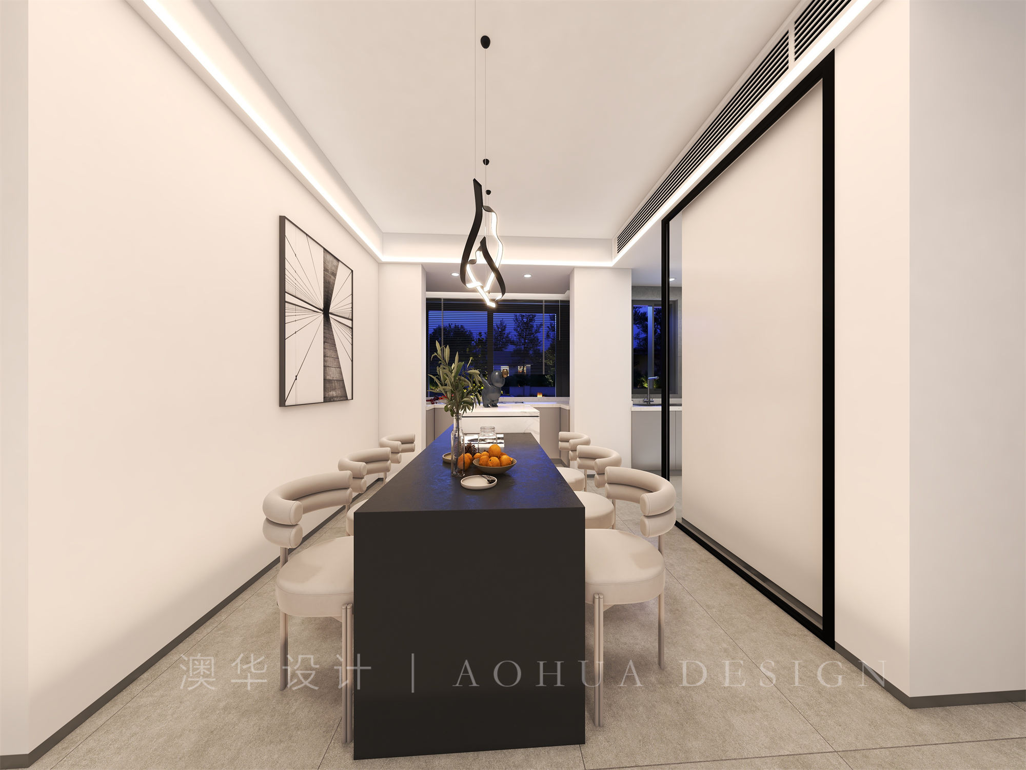 • 厨房和餐厅位于空间同一方位,L型的空间布局满足整个空间当中的要求,同时也保证整个空间当中的功能转化,满足整个空间当中的实用性