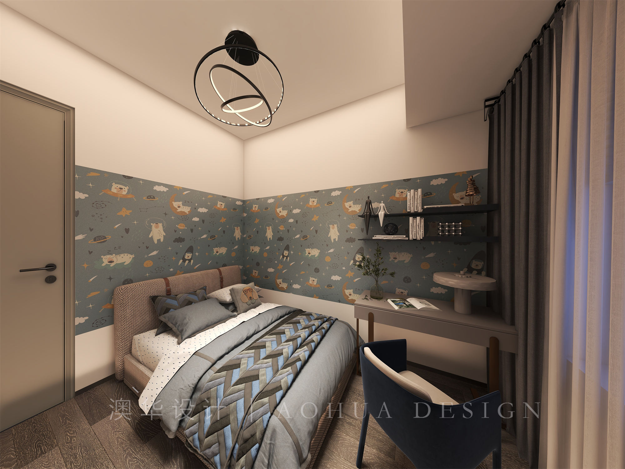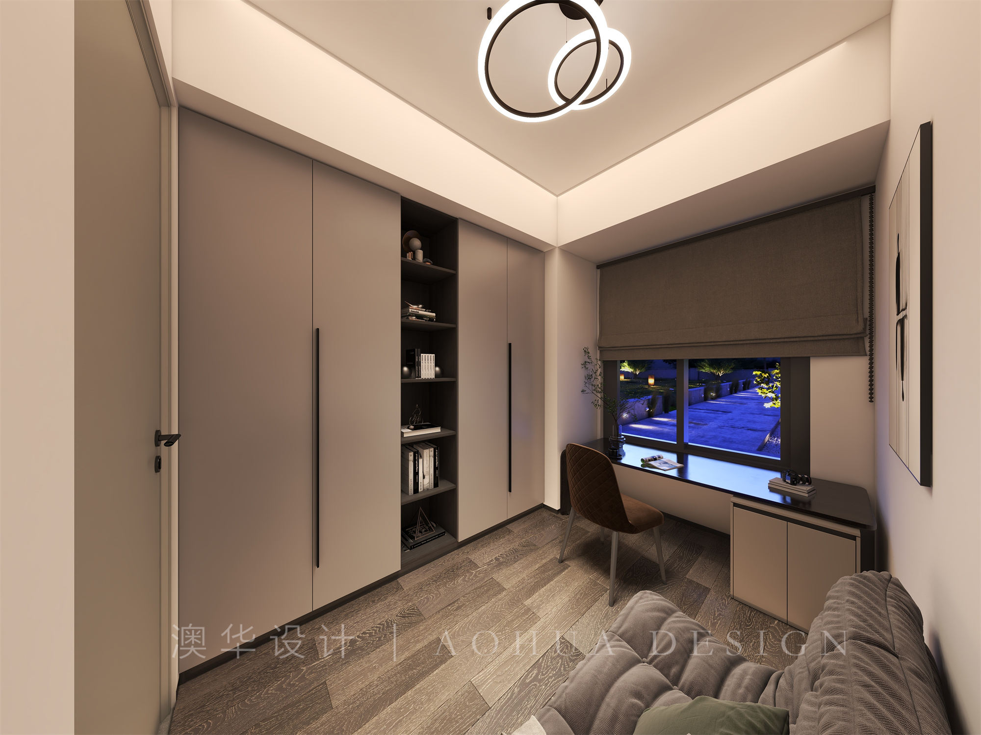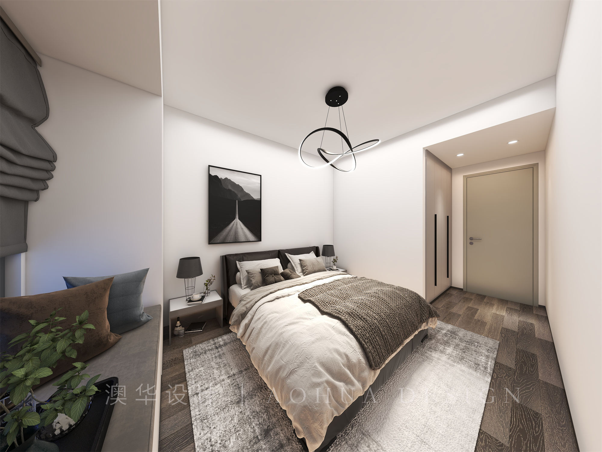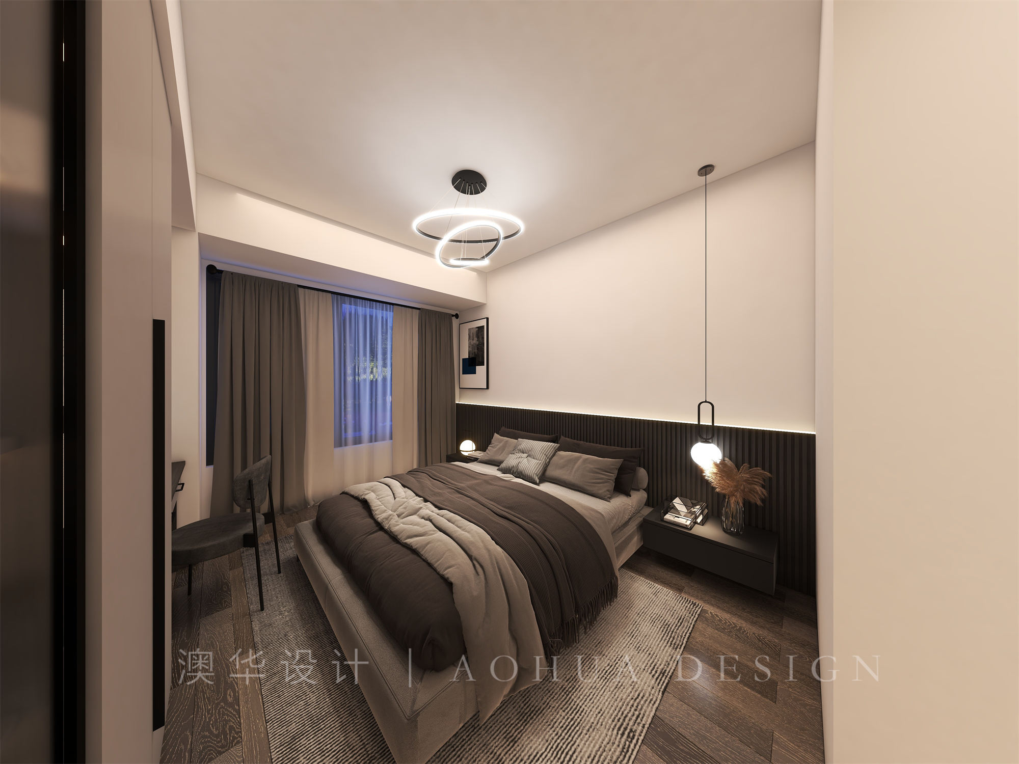 • 设计师在卧室当中和整体风格经营相互呼应,选择了灰色的地板,让整个空间变得更加低调,同时也让整个空间变得更加简约,表达整个空间当中的现代化。