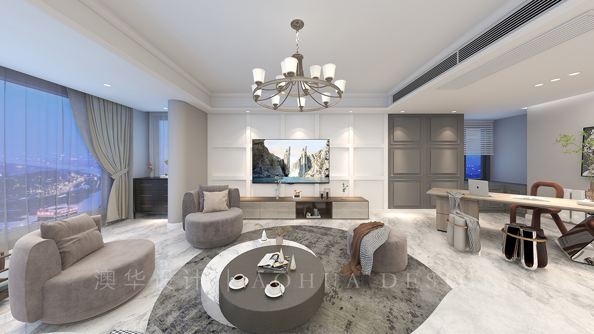 • 客厅空间在色彩的处理上整体采用低彩度、低饱和度色彩搭配,色块轻重搭配适宜,营造出随性与舒适的活动公区气氛。