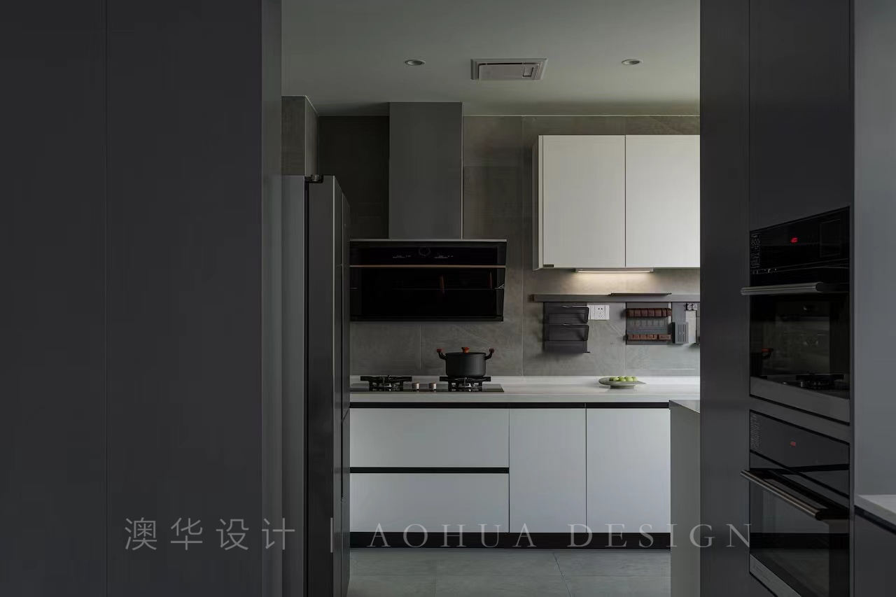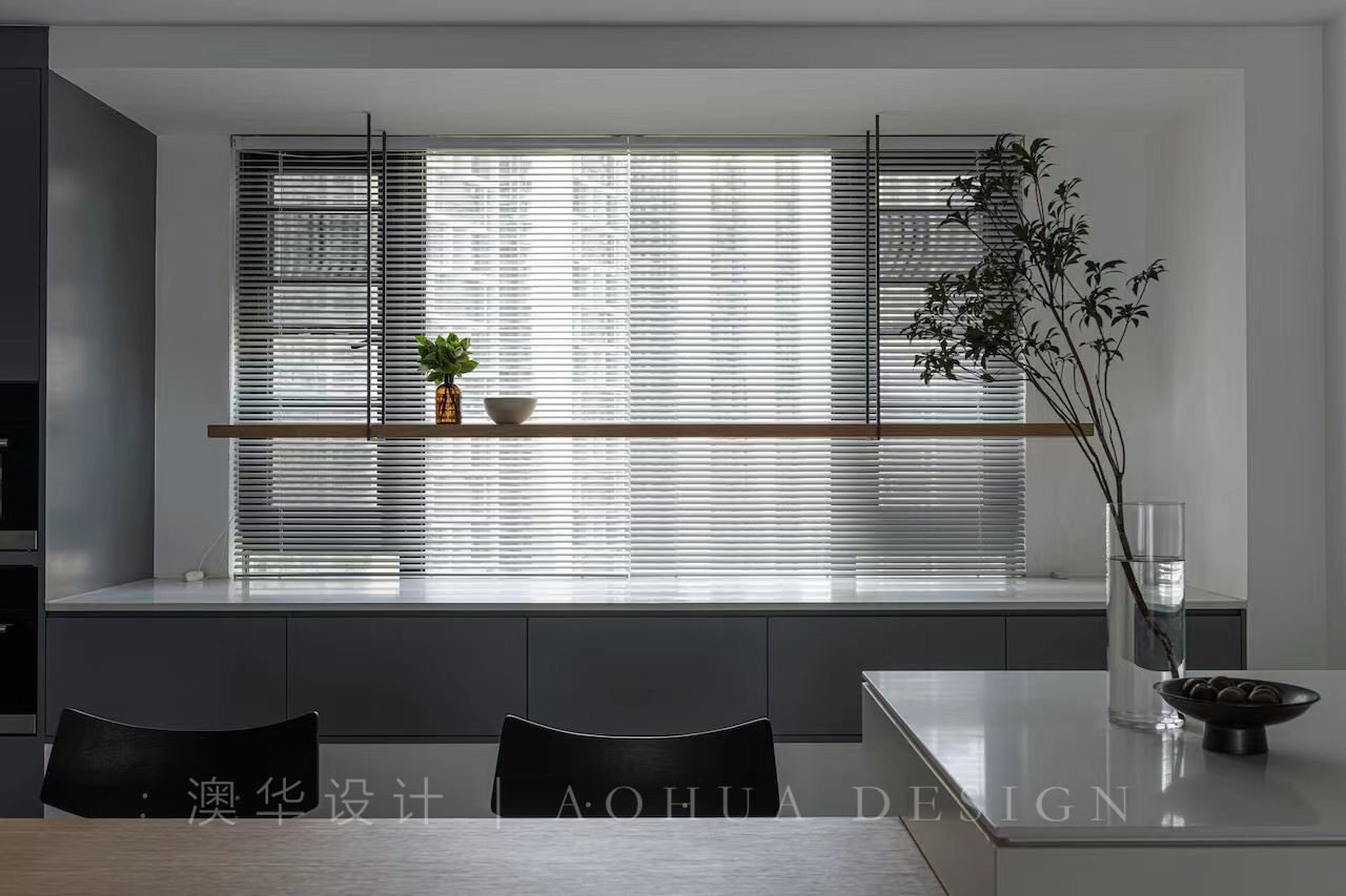 • 餐厅的岛台餐桌一体式设计,中岛台与餐桌错落有致,体现层次感的同时,显示不同位置的功能性,桌子集用餐和阅读于同一区域,让日常生活更加便利。
