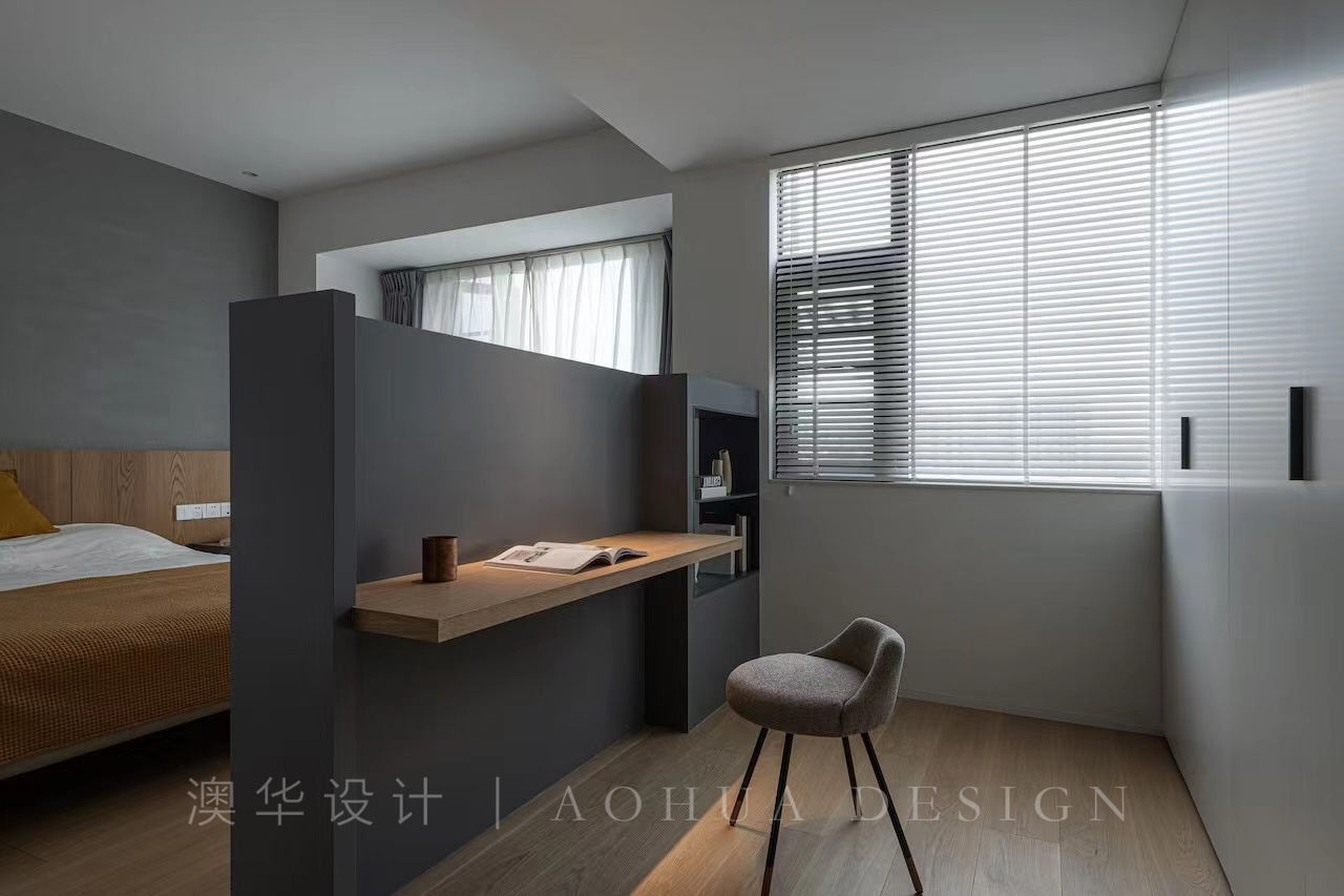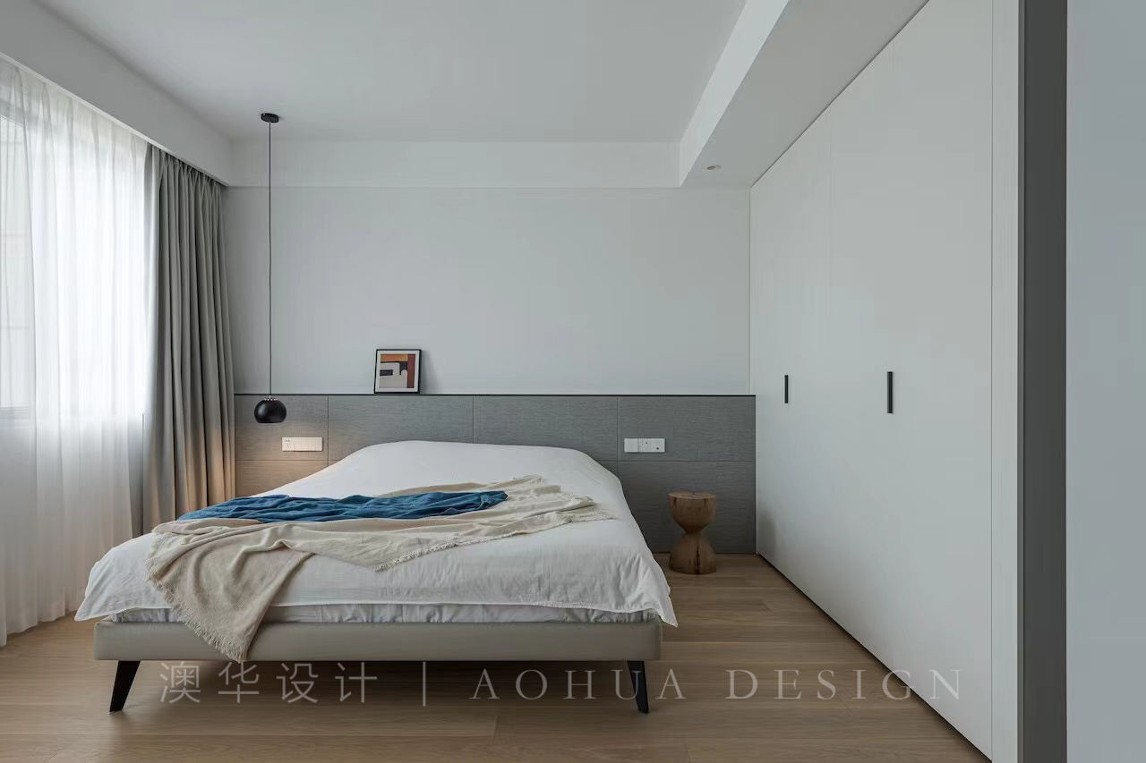 • 主臥大面玻璃窗使阳光能照进整個臥室,每天醒來都能一眼看到窗外景色,竖条百叶帘代替窗帘更加便于打理,定制深色木質床头柜与純白啞光衣柜不同材质的融合,使得原本拘束的摆放方式巧妙地重置,給原本零散的家具給予現代極簡的視覺統一。