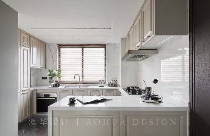 • 把厨房门洞的墙体向外推移,将原本L字形的橱柜改造成U字形,扩大的之余,增加空间实用性,洗碗机完美嵌入橱柜之中。