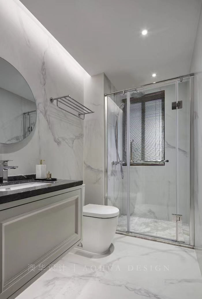 • 卫生间动线流暢,干湿分离,布局井然有序。隔断门矩形框架与极简矩形地漏纵橫交錯,規則简练的形狀,烘托空间的兼容性。