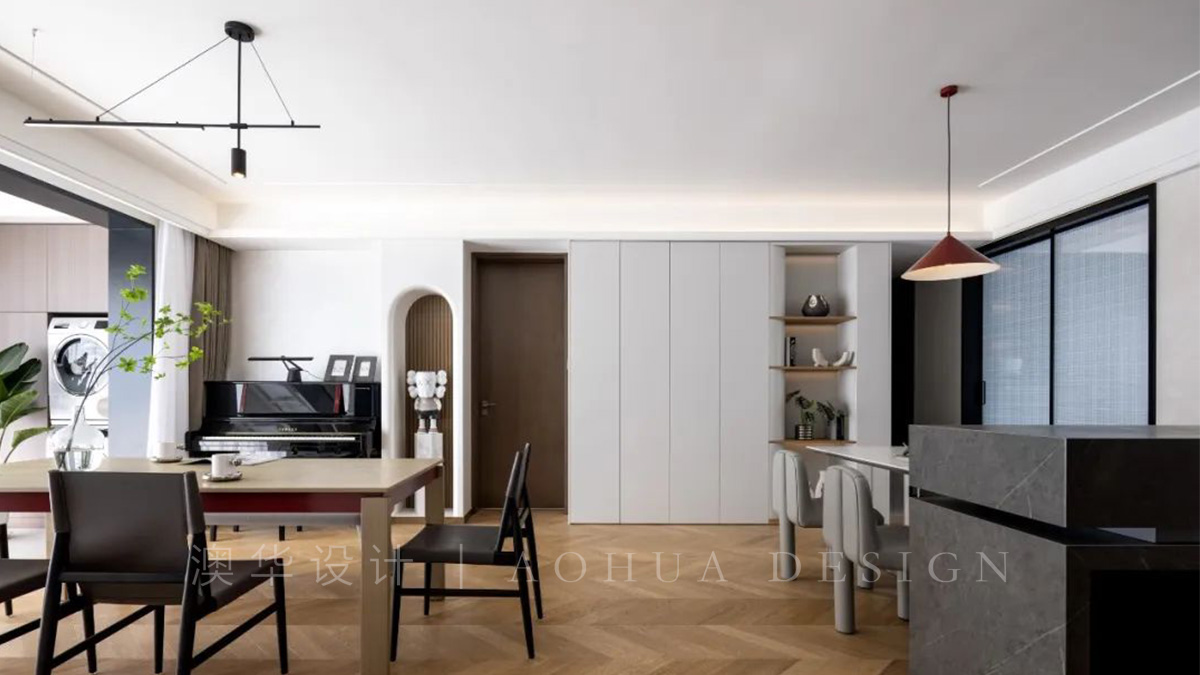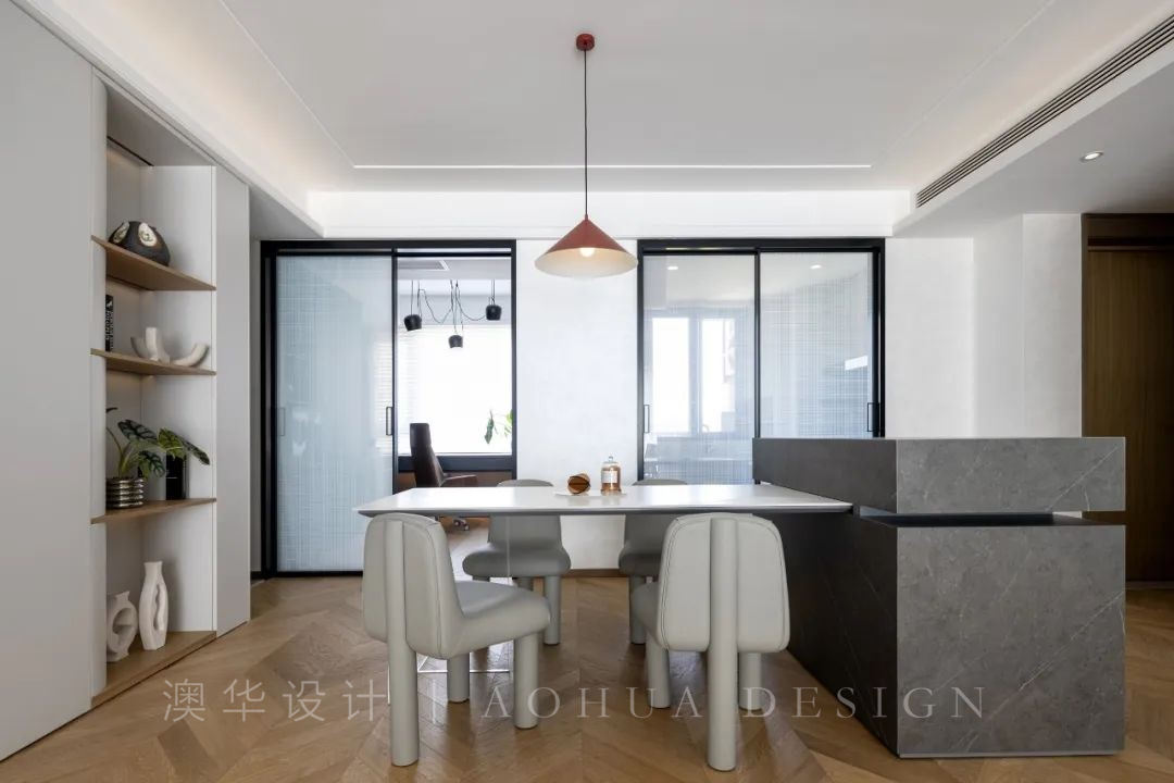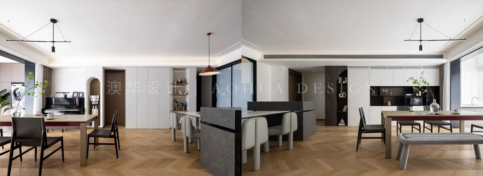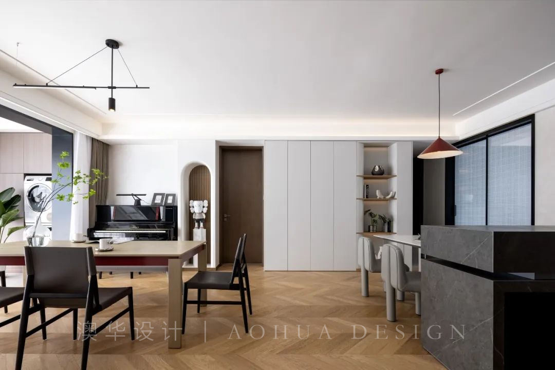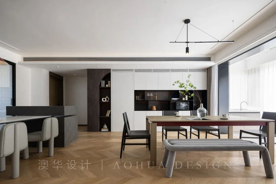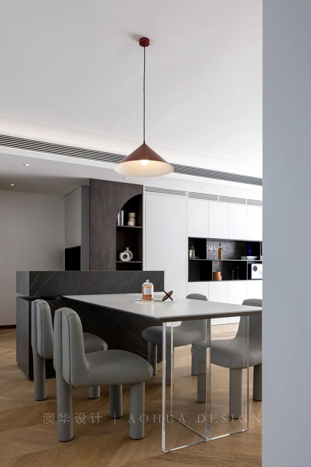 • 黑灰纹路大理石餐台,漆纹木质地板,搭衬简易明色的定制桌椅,无不叙述着空间中的恬静温暖