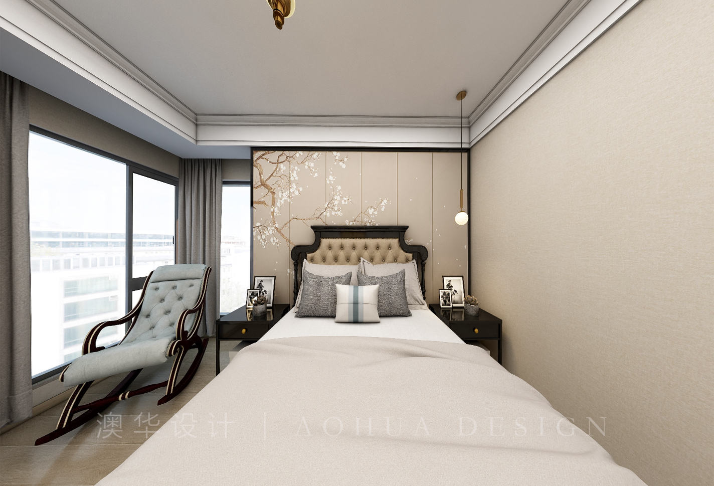 • 大大的落地窗与一把躺椅完美的与主卧室相融合,体现了卧室的豪华舒适感。