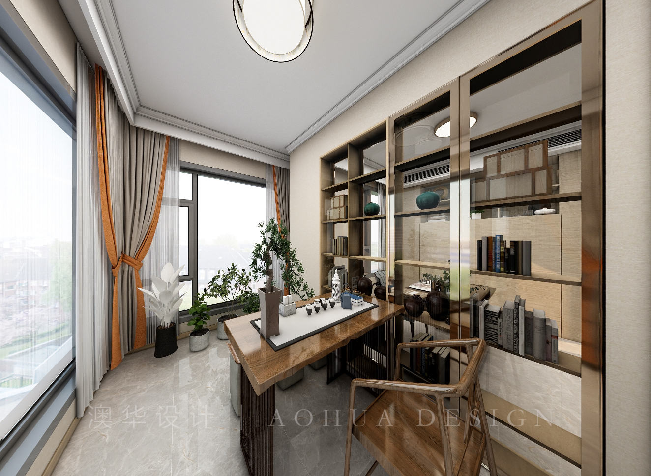 • 将休闲阳台与书房之间用玻璃展柜隔开,既起到了分隔空间的作用,又具有一定的展示功能。