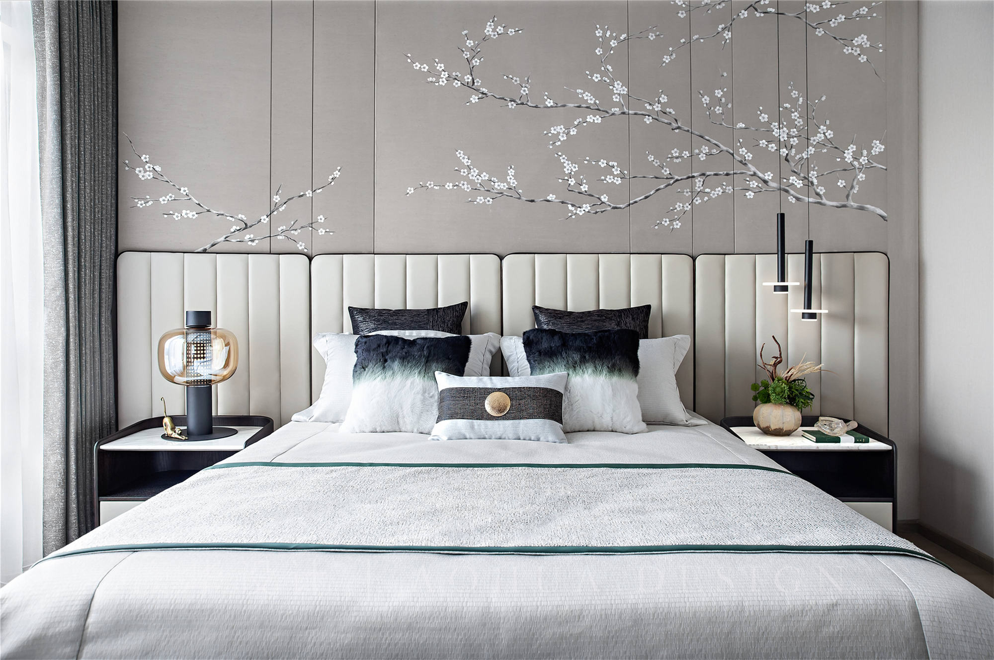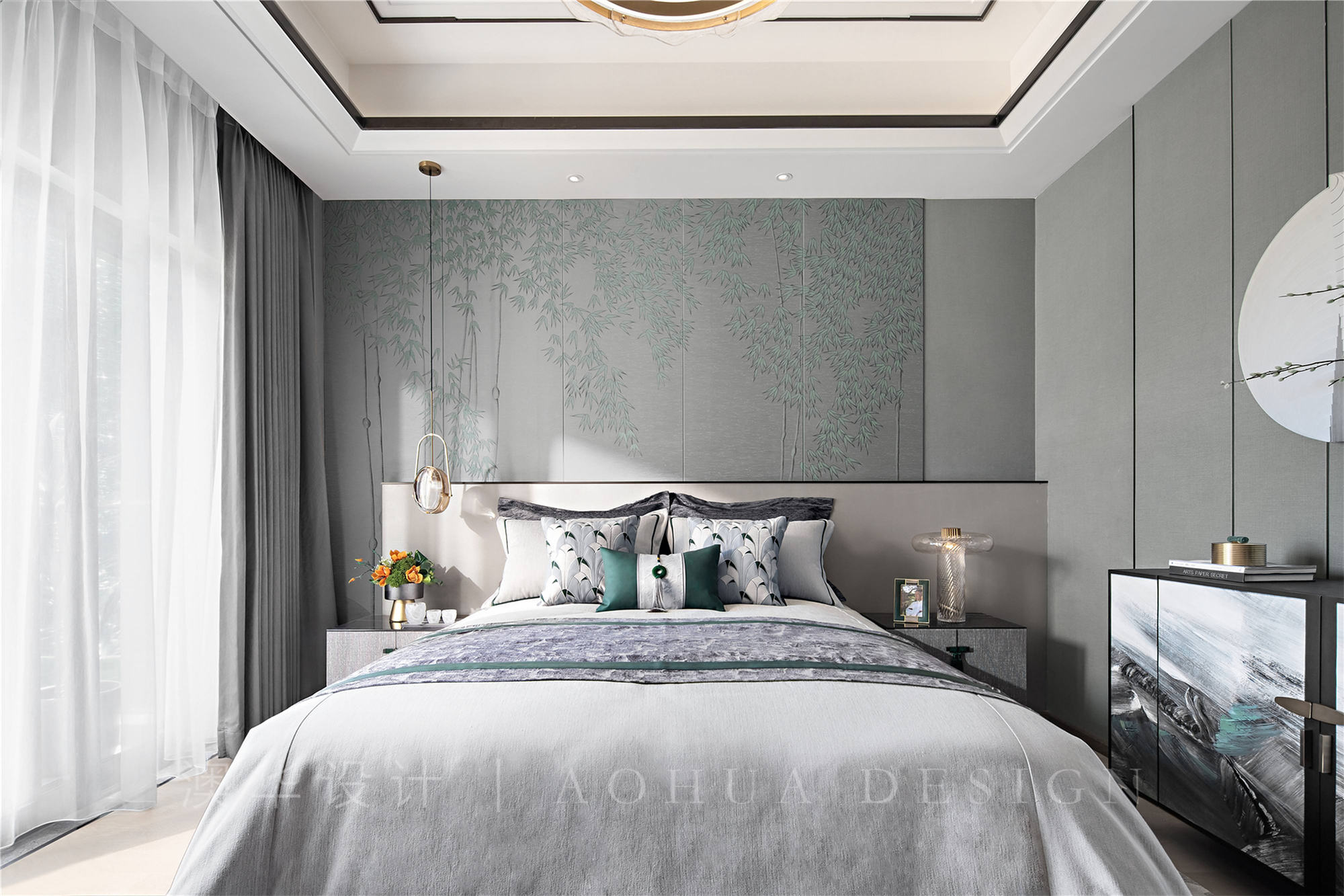 • 软包的床头背靠着‘竹态’纹样,柜体表面关不住的青山白雾,以现代抽象的手法表现中式韵味,当置身这种轻松舒适的空间里,切身感受到最好的时光就在此刻。