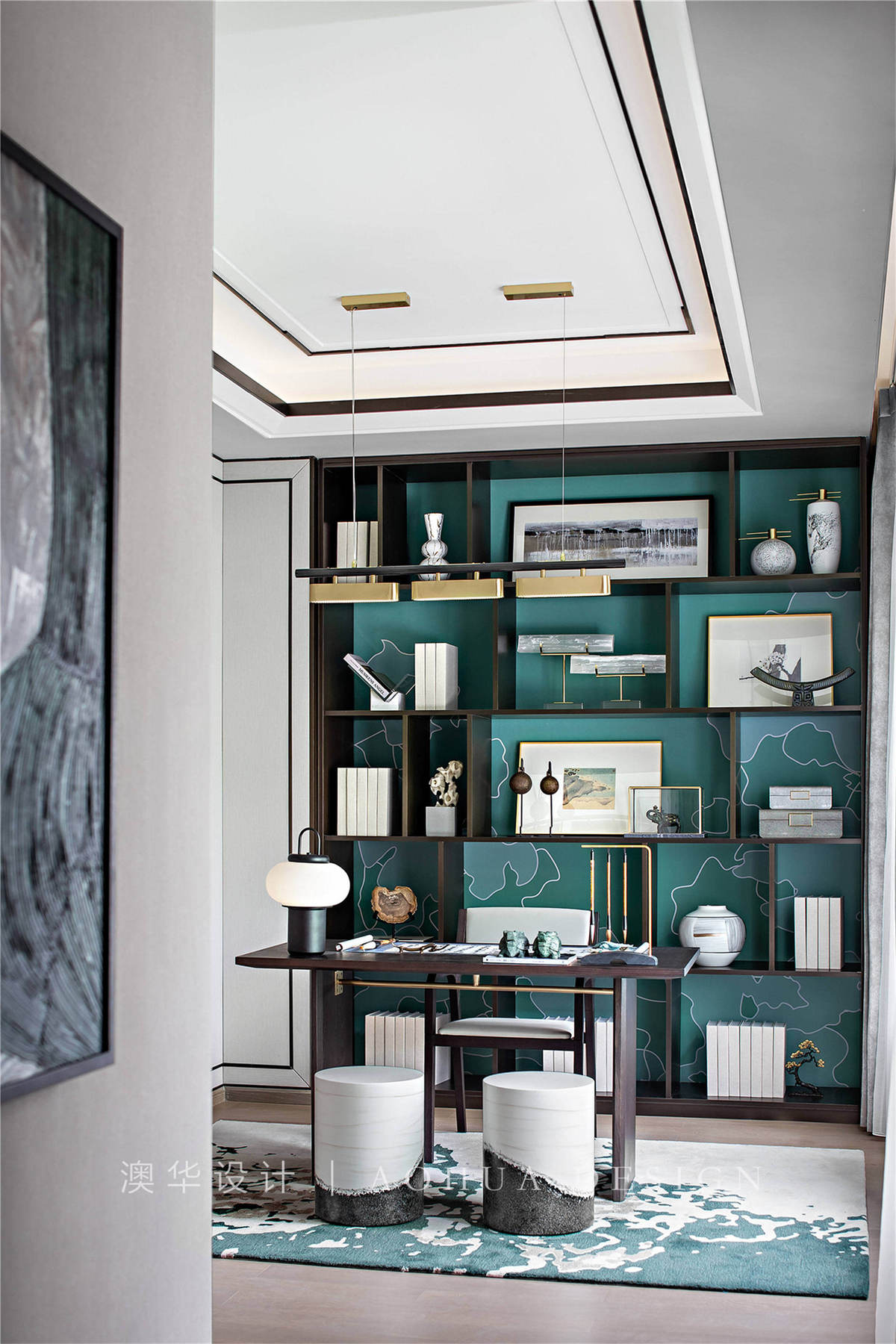 • 简化了繁复线条的中式家具兼具品质与格调,有温度的原木材质是空间呈现复古宁静的感受,墨绿色抽象的挂画增添艺术典雅的氛围,任由光影恍惚流转,在不言不语中丰富思绪与灵感。
