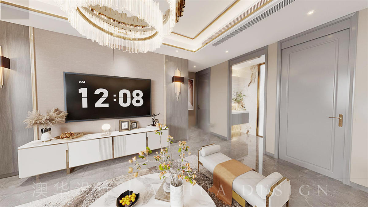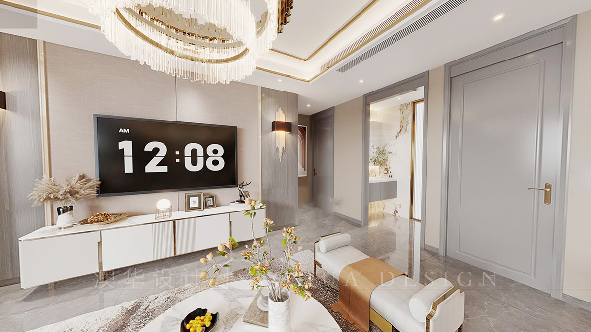 设计师将空间化零为整,确保了整体的动线流畅,保持了南北通透户型的采光和通风,再此基础上采用金属线条与石材的巧妙结合,打造出轻奢华丽的整体效果。