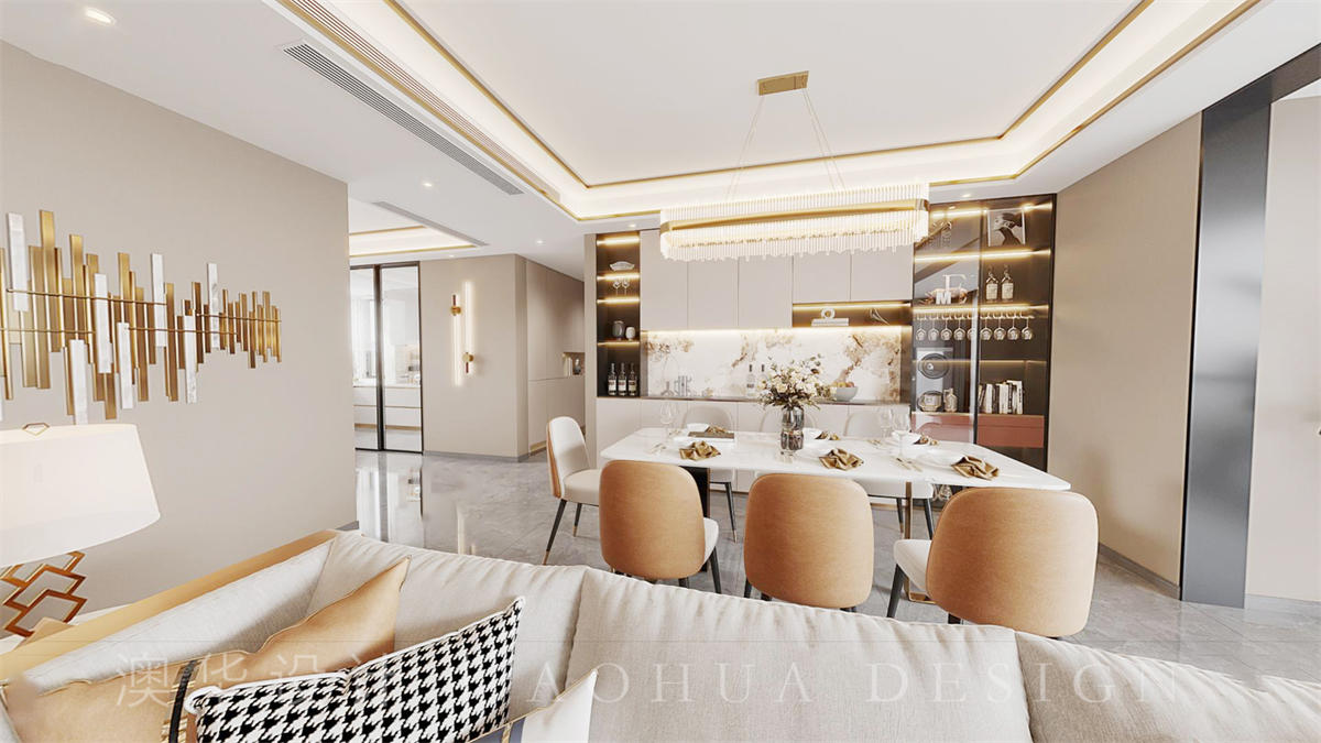 • 设计师大胆的运用了金属线条配合石材跟各种装饰的结合体现出整个客餐厅的华丽与高雅。