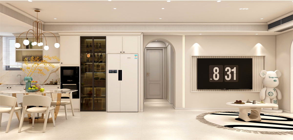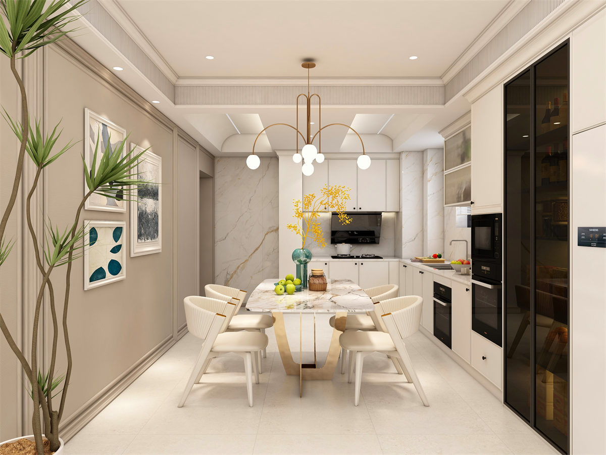 轻奢新法式风格演绎官廷法式的精致优雅,在线条上简化。化繁为简,通过细致的雕刻,栩栩如生的逼真造型,演绎时尚法式的清新韵味。选择淡雅、低调的设计来打造现代式的轻奢感。主要突出对称的布局方式,再结合几何线条与浅色的空间色彩。打造出一个法式轻奢主义的空间格调。