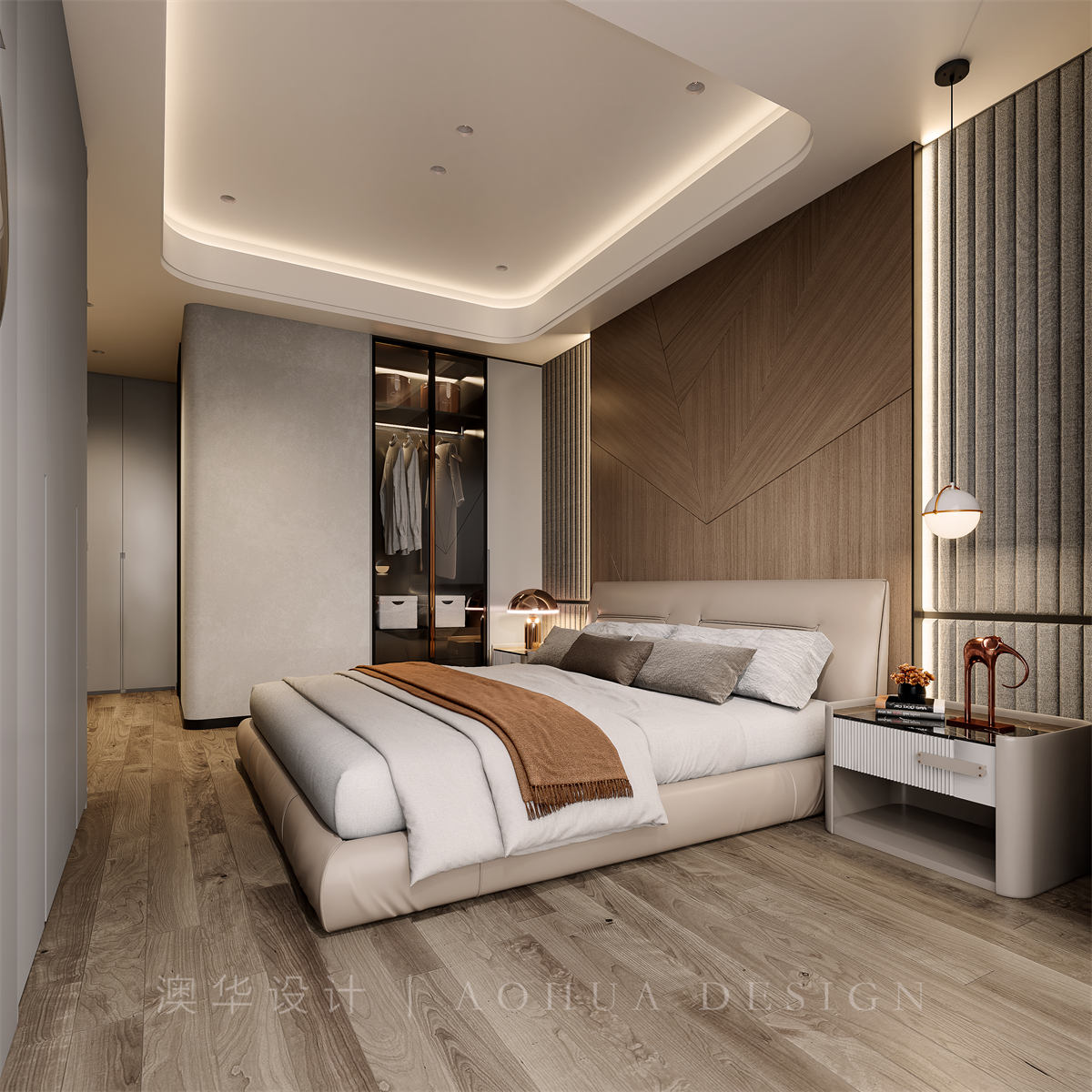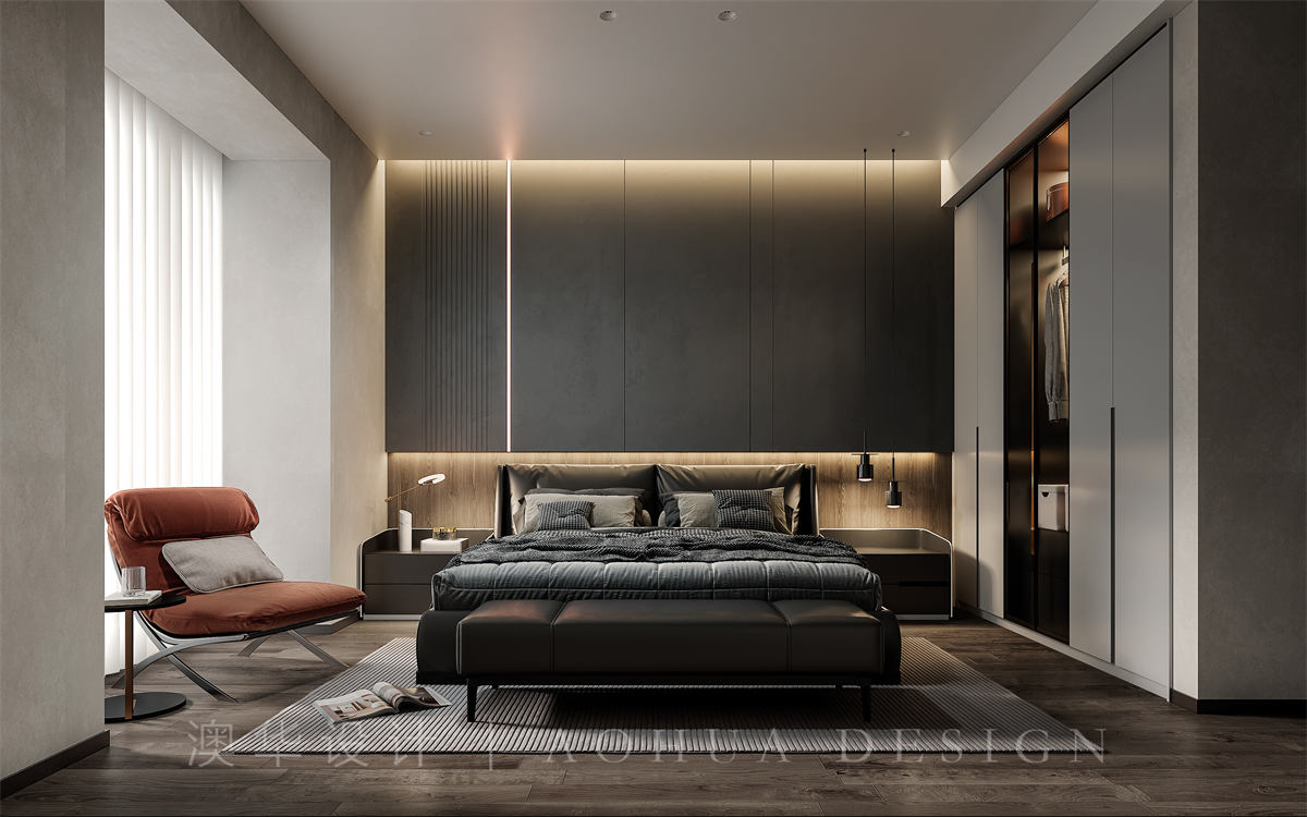 • 根据客户的想法进行深化设计,按照客户的喜好做了深色层次的设计,整个卧室优雅整洁。