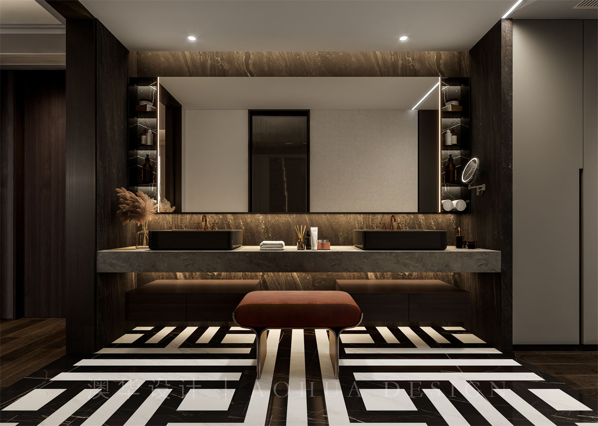 • 主卫做的干湿分区,干区做了超长的洗手台,中间进行了梳妆台的设计,高端贵气。