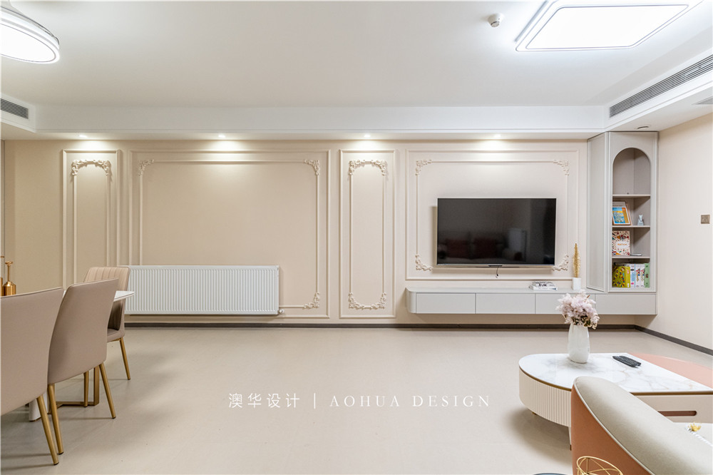 于硬装设计中捕捉法式浪漫的气韵,沙发背景墙以细腻的石膏线、雕花装饰,铺就优雅简练的空间底色;再通过圆弧门洞自然衔接餐厅墙面,延展视觉的同时更给空间带去一丝曼妙,让人瞬间坠入温柔怀抱。