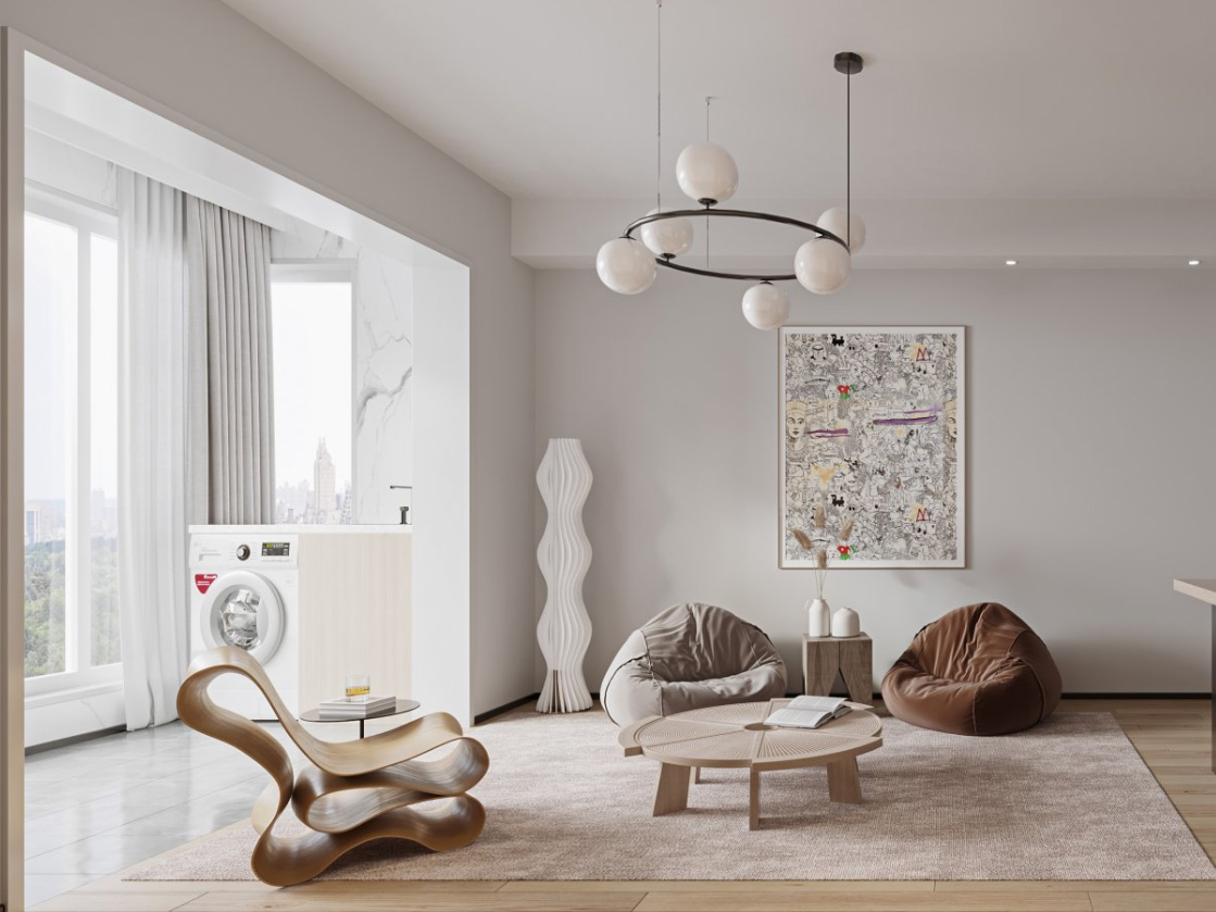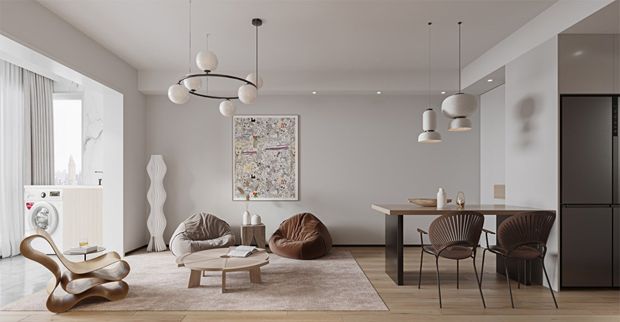 大面积的白色搭配上灰色沙发,整体给人简约的朴素感。而由弧线组成的木色地毯则为空间增添了一抹不一样的独特气息。
