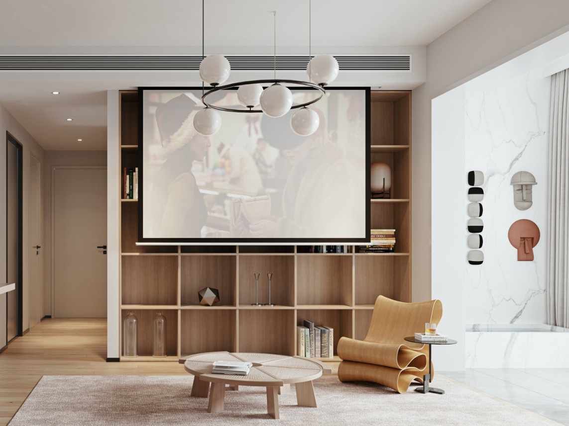 预留一间客房,供亲朋好友来访时休憩。此外,这里也是静谧的办公区,书桌之上,设置两排置物搁板,既可用于展示,又具有收纳功能,整体设计简洁,完美融入卧室的宁静氛围。