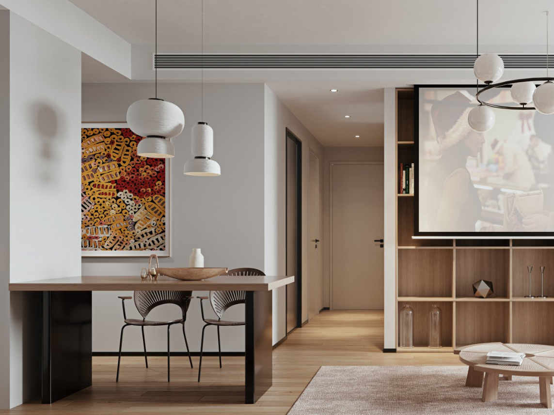 这个家的餐厅与玄关区域巧妙融合 6686官方版app,定制玄关柜与嵌入式餐边柜紧密相连,冰箱被完美包裹,既体现了空间的连贯性,也为家居生活增添了品质感。